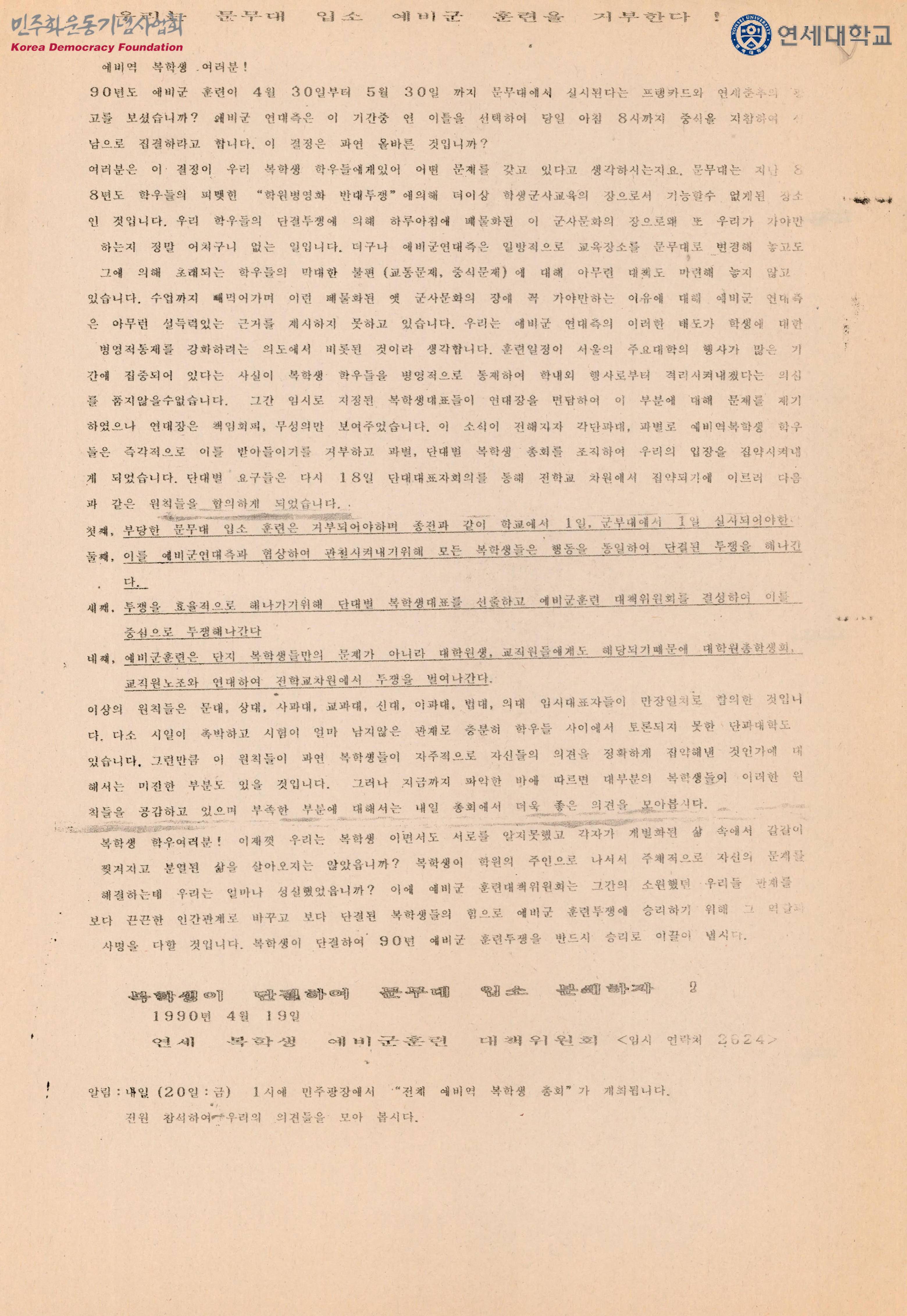 - 각 단과대, 과별로 예비역복학생 총회를 조직하여 병졍적통제를 강화하려는 의도에서 비롯된 예비군 문무대 입소훈련을 거부하는 입장의 내용이 수록된 유인물로 주장은 다음과 같음 첫째, 부당한 문무대 입소 훈련은 거부되어야하며 종전과 같이 학교에서 1일, 군부대에서 1일 실시되어야한다 둘째, 이를 예비군연대측과 협상하여 관철시켜내기위해 모든 복학생들은 행동을 통일하여 단결된 투쟁을 해나간다 셋째, 투쟁을 효율적으로 해나가기위해 단대별 복학생대표를 선출하고 예비군훈련 대책위원회를 결성하여 이를 중심으로 투쟁해나간다 넷째, 예비군훈련은 단지 복학생들만의 문제가 아니라 대학원생, 교직원들에게도 해당되기때문에 대학원총학생회, 교직원 노조와 연대하여 전학교차원에서 투쟁을 벌여나간다