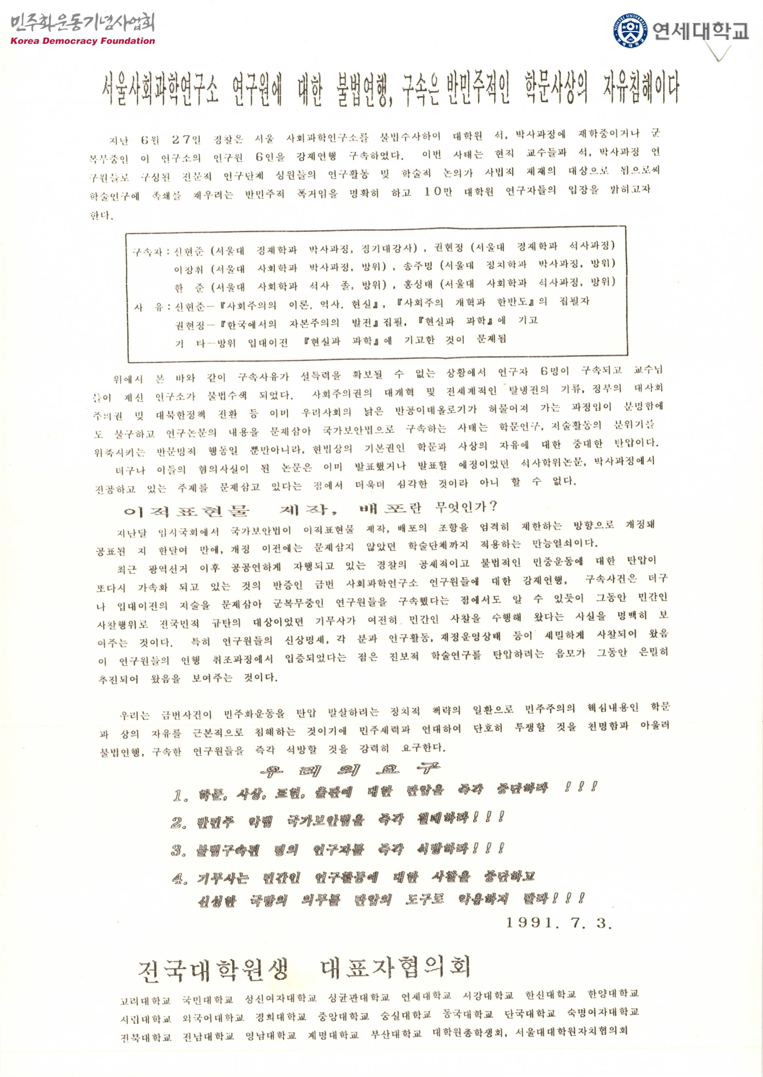- 경찰이 서울사회과학연구소를 불법수사하여 대학원 석, 박사과정에 재학중이거나 군 복무중인 연구원 6인을 강제연행, 구속하였다는 내용, 이 사건이 민주화운동을 탄압, 말살하려는 정치적 책략의 일환으로 민주주의의 핵심내용인 학문과 사상의 자유를 침해하는 것이기에 민주세력과 연대하여 단호히 투쟁할 것이라는 내용 등이 수록된 유인물