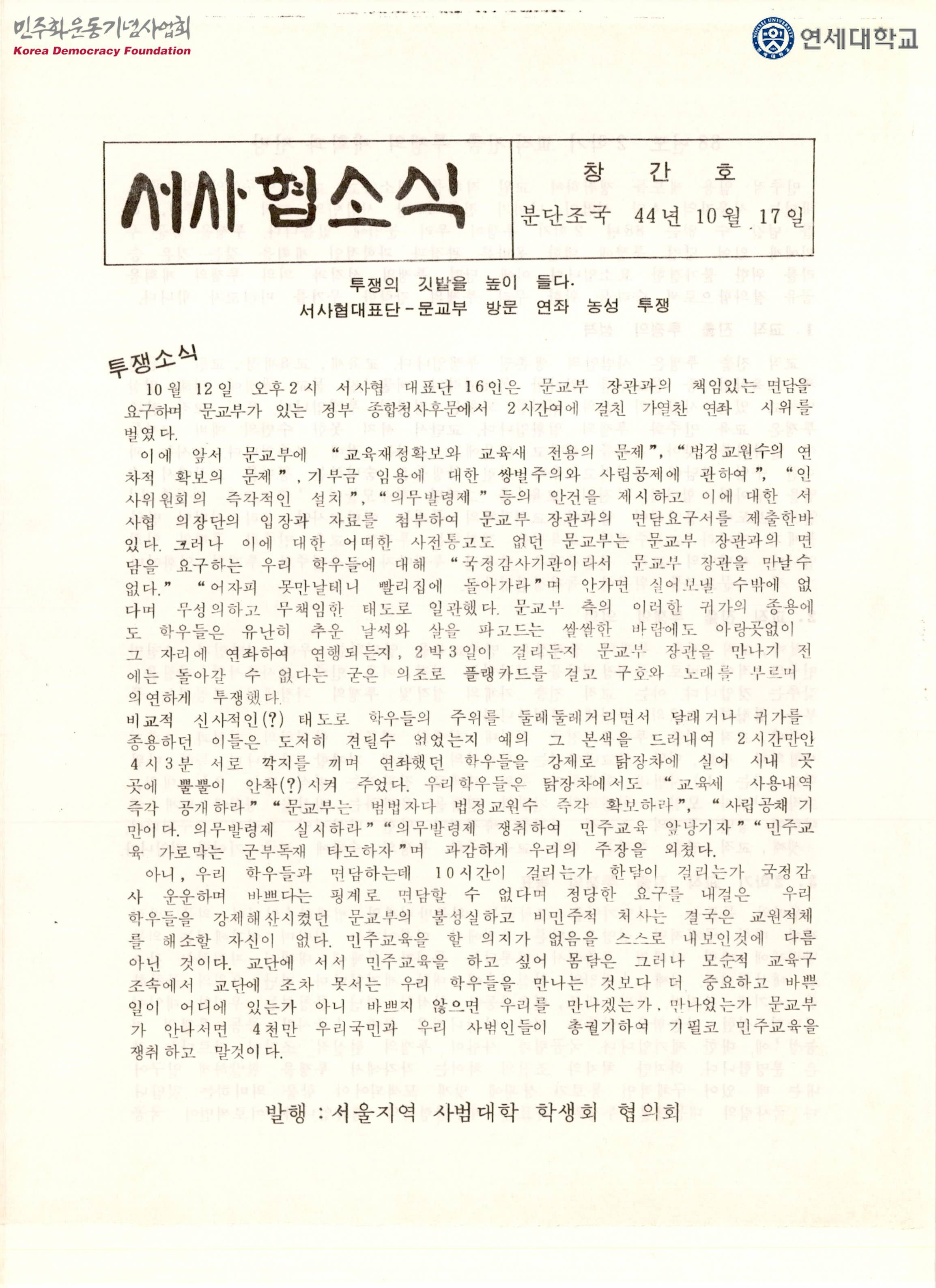 - 서사협 대표단 16인이 문교부 장관과의 책임있는 면담을 요구하며 문교부가 있는 정부 종합청사 후문에서 2시간여에 걸친 연좌 시위를 벌였다는 내용, 88년도 2학기 교직 진출 투쟁의 성격과 의의 투쟁의 계획을 공유, 결의함으로써 승리를 위한 투쟁의 강력한 무기를 마련하고자 한다는 내용 등이 수록된 유인물