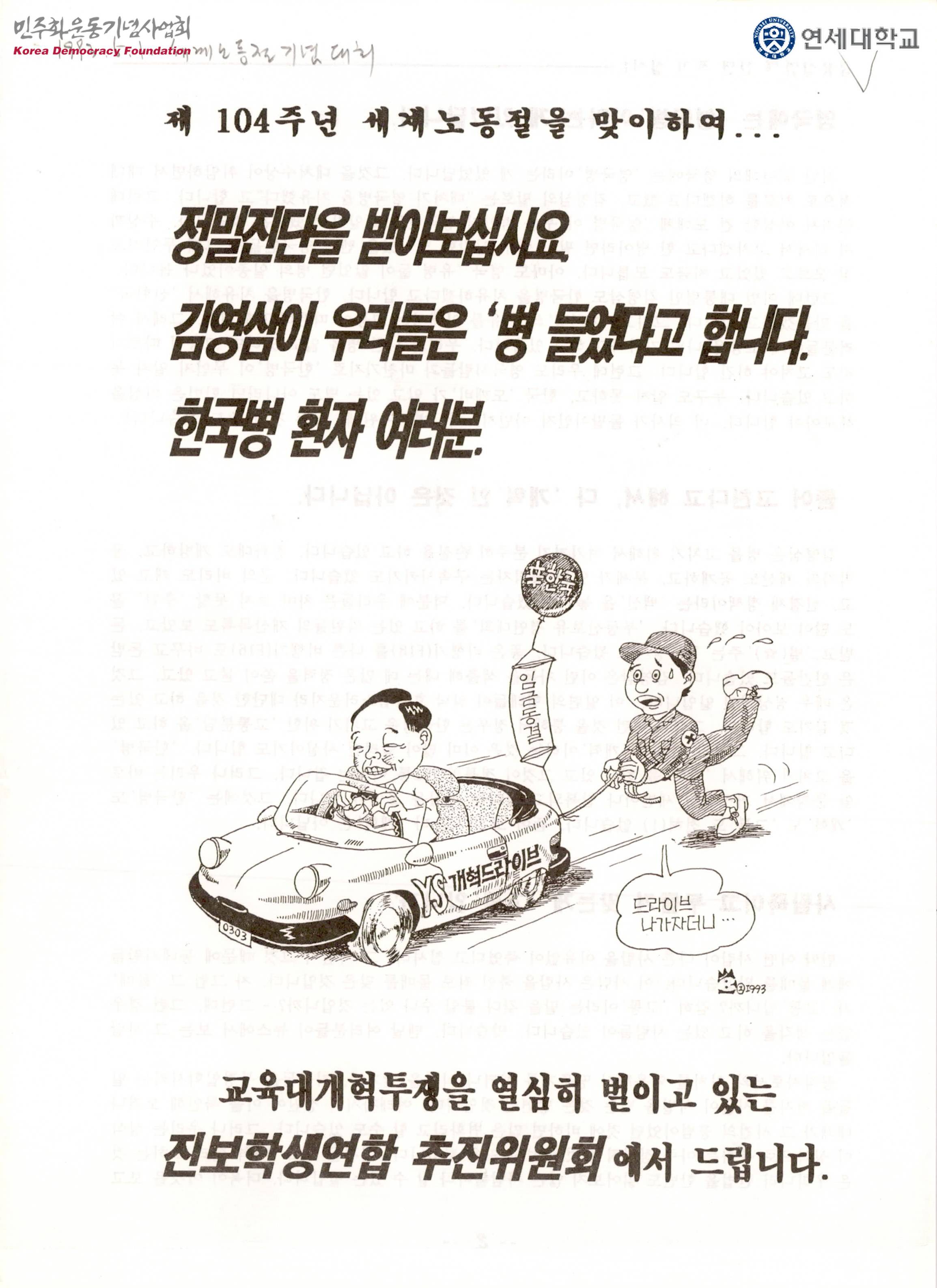 - 김영삼은 자본의 취약한 수출경쟁력과 생산력에서 비롯된 한국경제의 위기상황을 한국병이라는 이데올로기로 어물쩡 덮고 그 부담을 노동자에게 고통분담이라는 이데올로기로 전가함으로써 경제난국을 해결하려는 구시대적인 발상을 하고 있다는 내용 등이 수록된 유인물