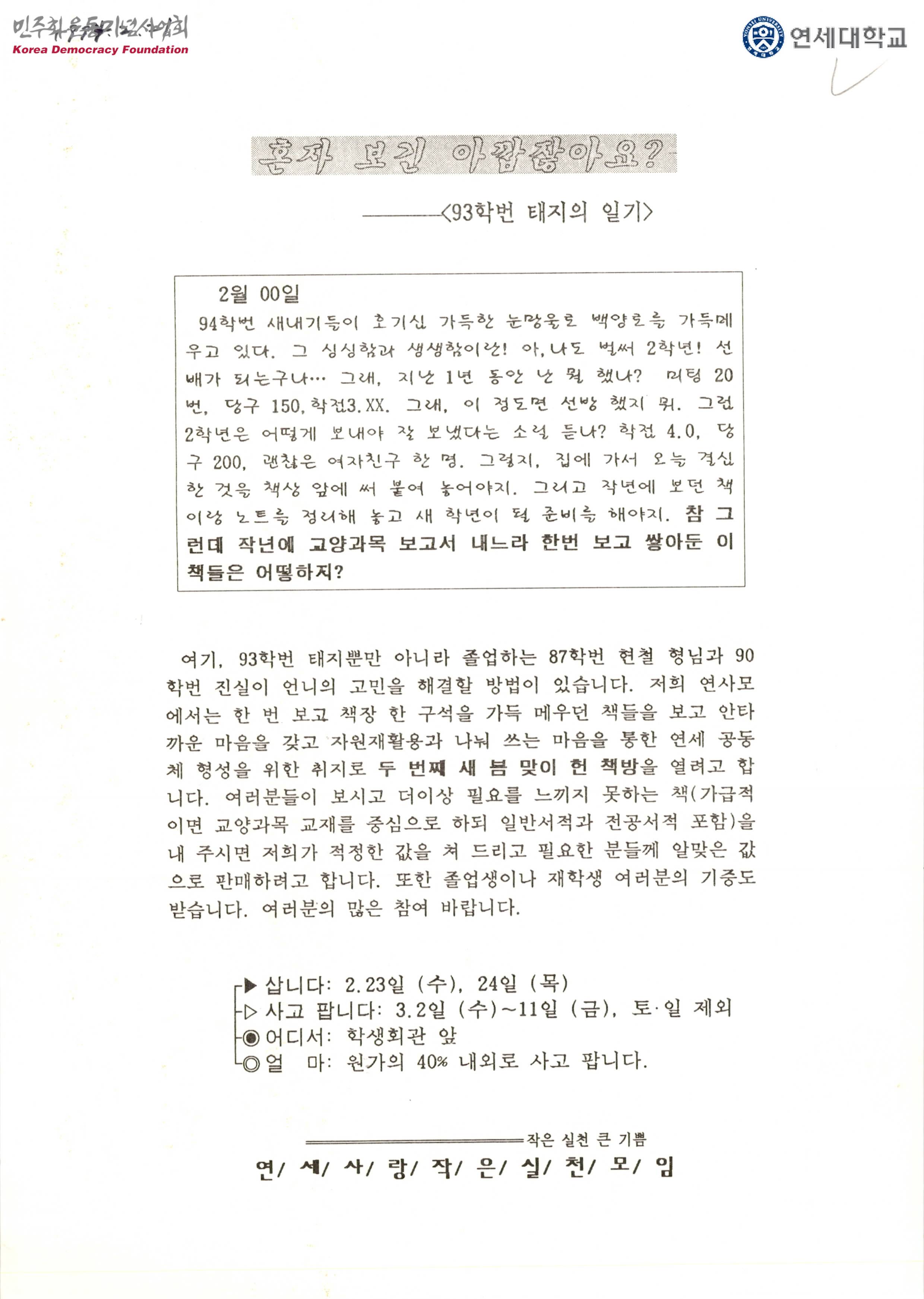 - 한 번 보고 책장 한 구석을 가득 메운 책들을 재활용하여 나눠 쓰는 마음을 통한 연세 공동체 형성을 위한 취지로 두번째 새 봄 맞이 헌 책방을 열려고 한다는 내용, 더 이상 필요를 느끼지 못하는 책을 내주면 적정한 값으로 판매하려 한다는 내용 등이 수록된 유인물