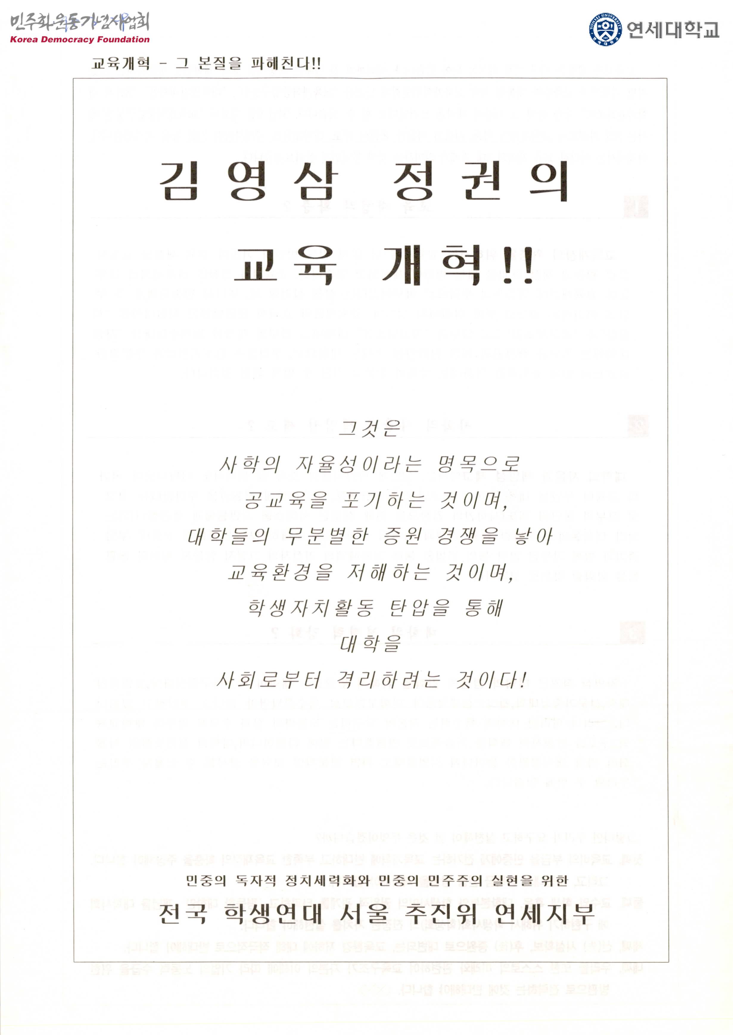 - 김영삼 정권은 교육 개혁안으로 교육재정의 확충, 사학의 자율과 책임성 제고, 대학교육의 국제경쟁력 강화 등을 제시했으며, 이것은 사학의 자율성이라는 명목으로 공교육을 포기하는 것, 대학들의 무분별한 증원 경쟁을 낳아 교육환경을 저해하는 것, 학생자치활동 탄압을 통해 대학을 사회로부터 격리하려는 것이라는 주장 등이 수록된 유인물