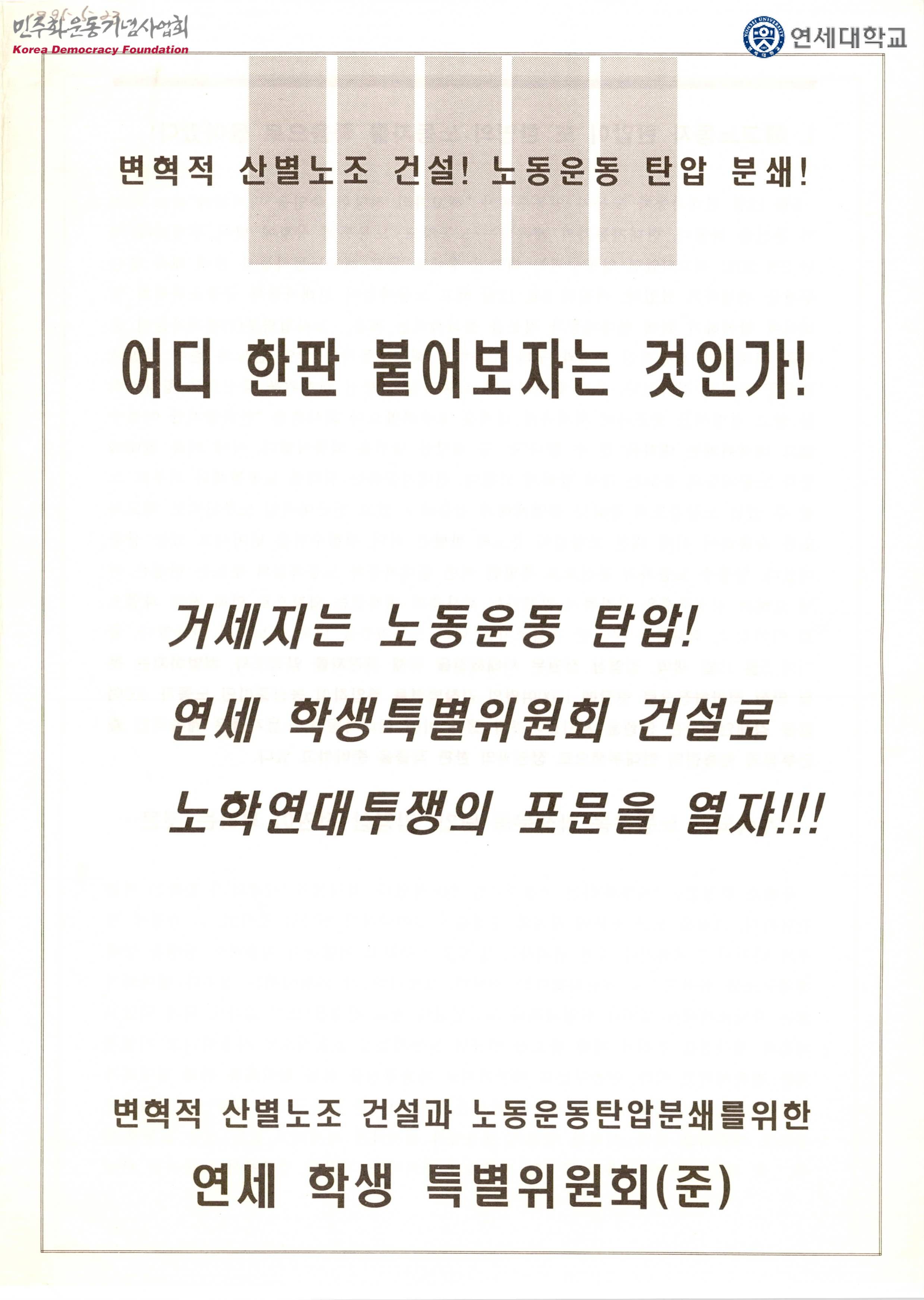 어디 한판 붙어보자는 것인가! : 거세지는 노동운동 탄압! 연세 학생특별위원회 건설로 노학연대투쟁의 포문을 열자!!!