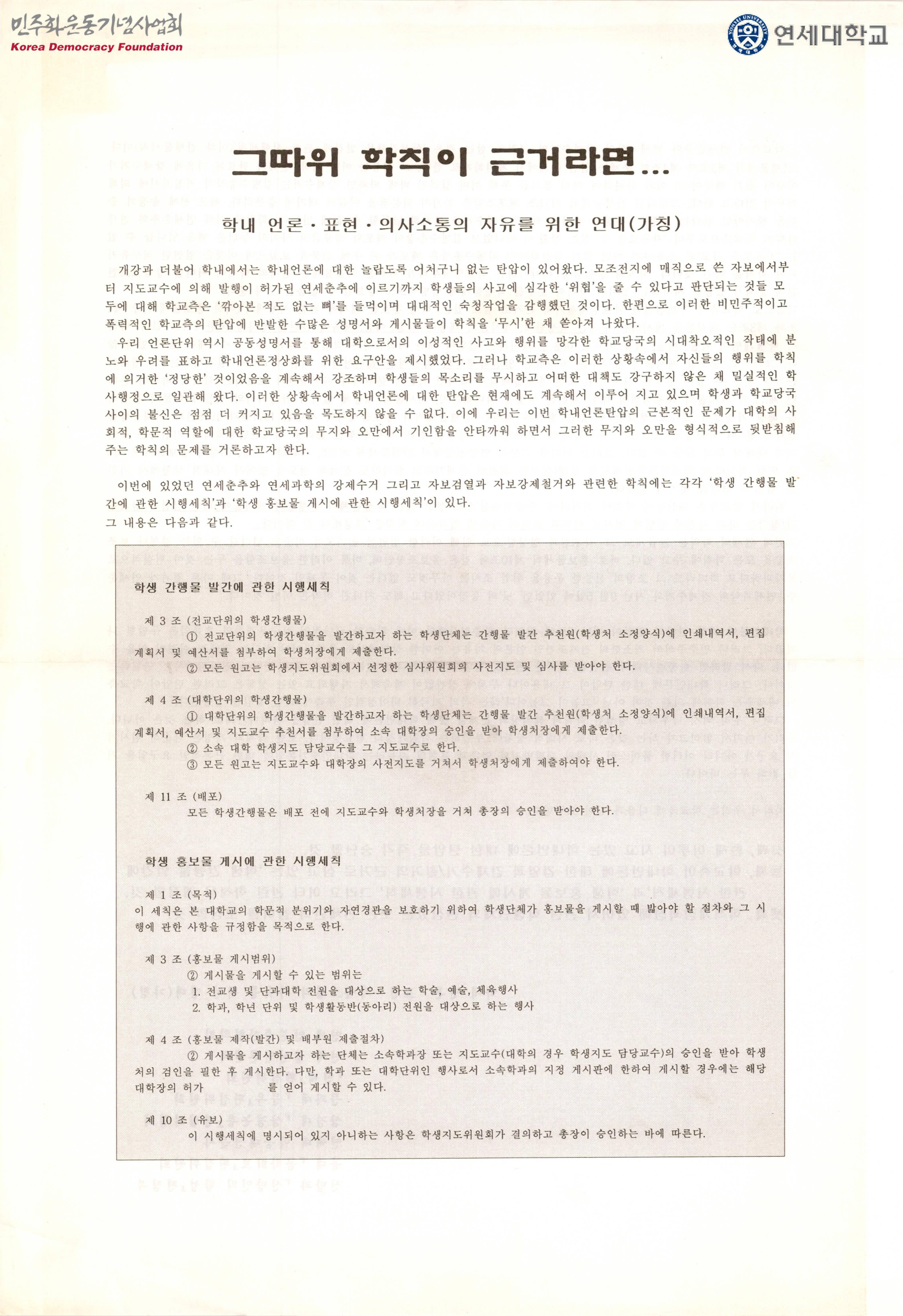 - 학내언론에 대한 탄압의 원인이 한총련사태와 이에 편승한 극단적인 보수우경화의 흐름임은 두말할 나위가 없으나, 민주주의의 최소한의 전제조건인 언론의 자유는 어떠한 상황에서도 존중되어야 한다는 점에서 이견이 있을 수 없으며, 한총련사태와 관련된 어떠한 논의도 학내에서 일어나고 있는 언론에 대한 탄압과 연결되어서는 안된다는 주장 등이 수록된 유인물