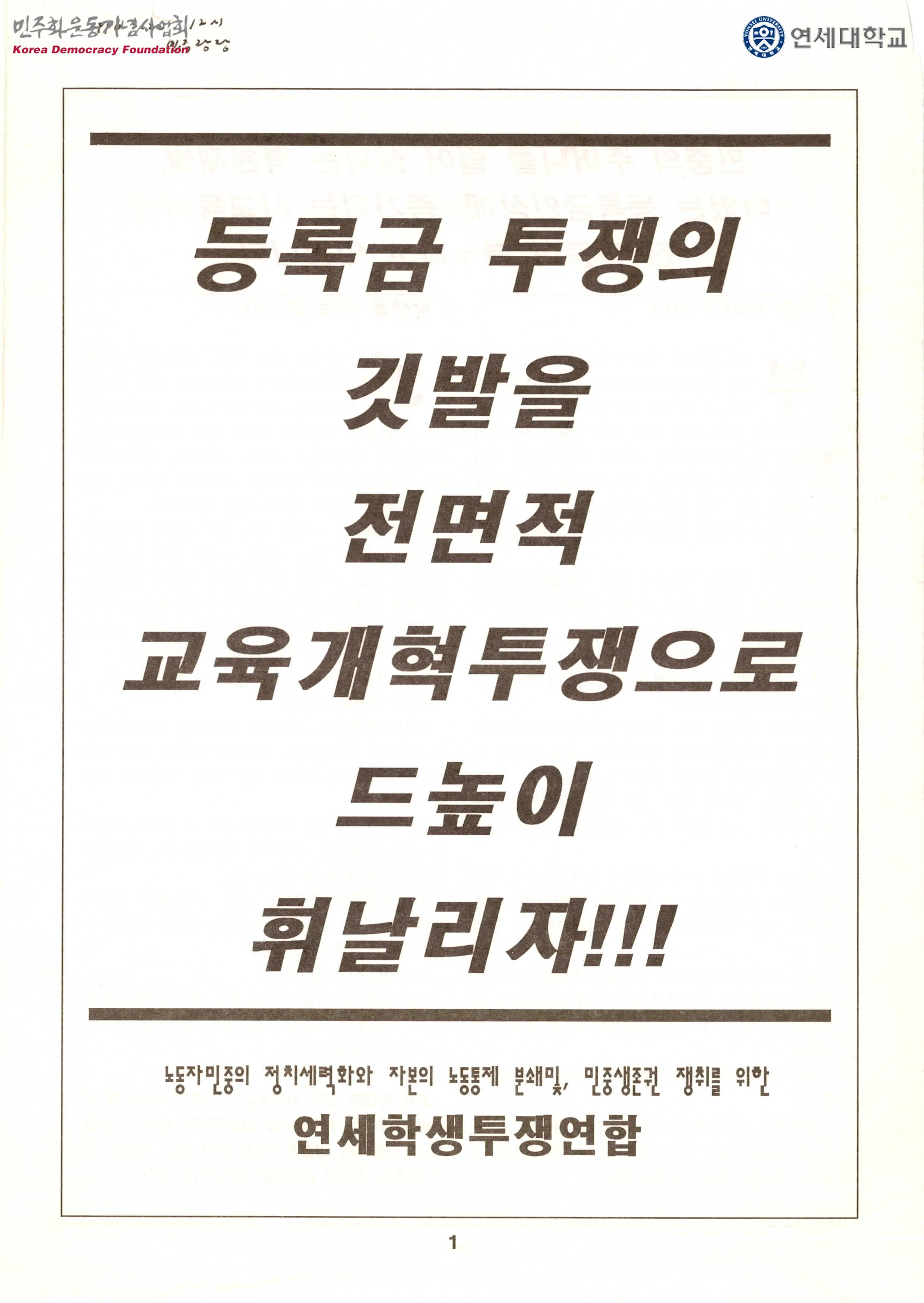 - 막대한 양의 사교육비가 민중의 주머니를 갉아먹고 국가가 책임져야할 교육재정의 확보가 간접세의 이름으로, 생활필수품에 붙고 있고, 이것은 결국 계층간, 계급간 불평등을 심화시키는 것이라는 내용, 등록금의 폭등은 한 일면일 뿐이며 기만적인 등록금인상에 투쟁하는 것과 동시에 단순히 몇 %인하의 문제로서 이 투쟁을 마무리지어서는 안 된다는 내용 등이 수록된 유인물
