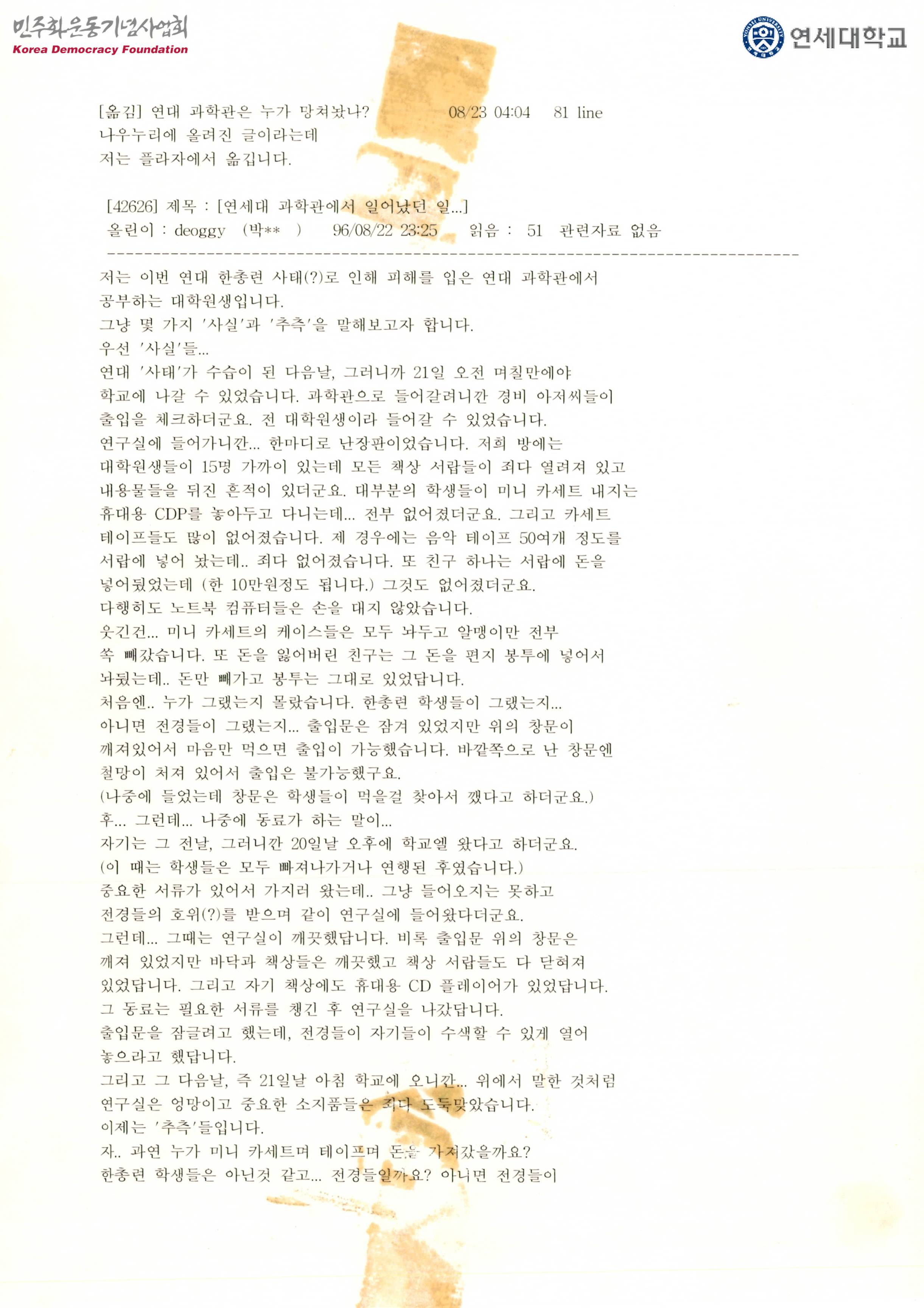 - 연세대사태가 수습된 다음 날인 8월 21일 오전에 학교에 나갈 수 있게 되어 연구실에 들어갔더니 모든 책상 서랍은 죄다 열려있고 내용물을 뒤진 흔적이 있다는 내용, 과연 이것을 한총련 학생들이 한 것일지, 전경들이 한 것일지 추측하고 있는 내용 등이 수록된 유인물