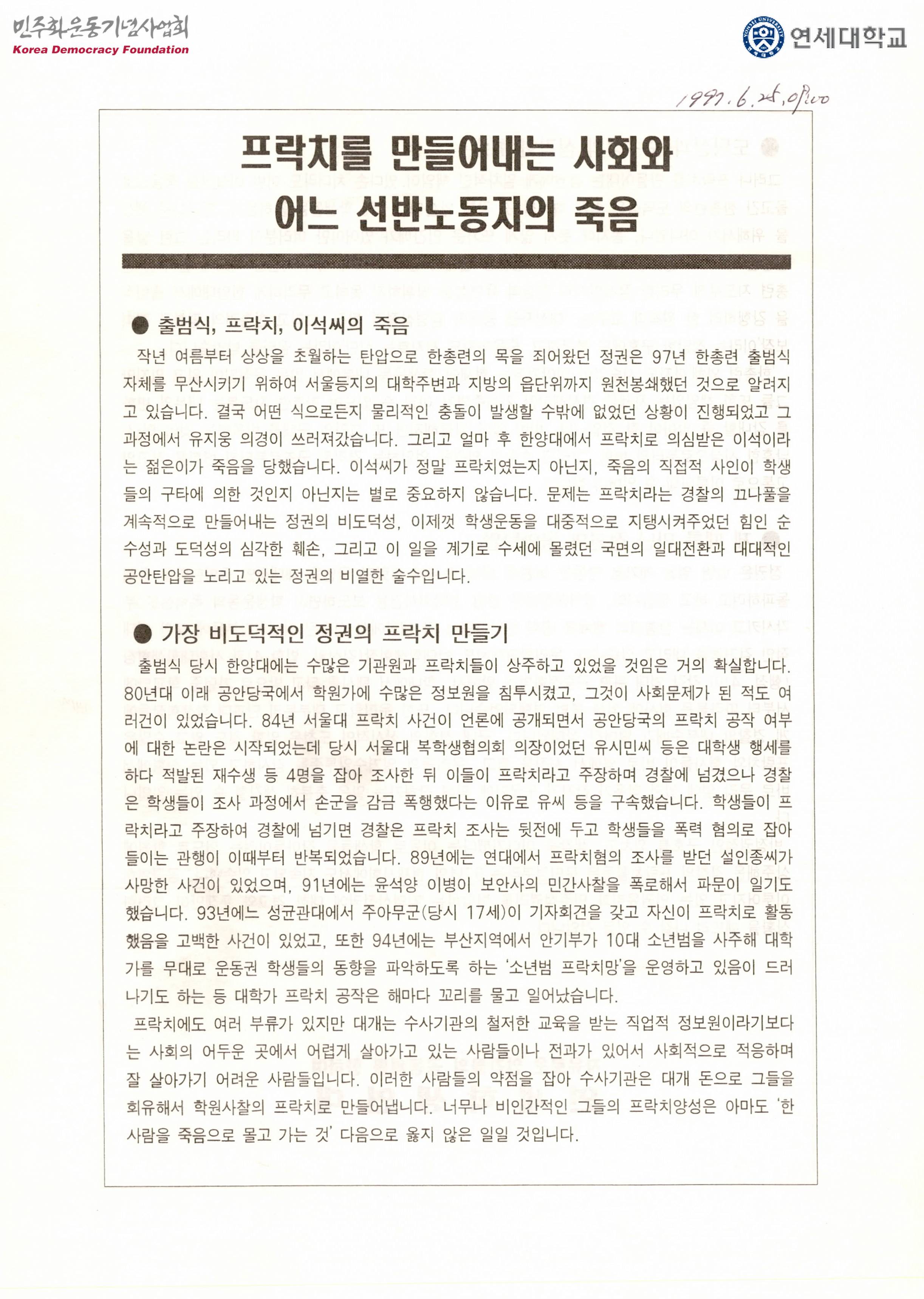 - 김영삼 정권은 연일 프락치사건을 보도하면서 학생운동의 폭력성을 부각시키고 이제는 한총련의 해체를 공식 선언하면서 각 대학에서 선출된 학생회간부들에 대한 대대적인 검거령을 내리고 있다는 내용, 공공연히 이루어지고 있는 인권유린과 민주적 권리를 박탈하는 김영삼 정권에 대한 경고와 투쟁만이 그러한 상황을 깨뜨릴 수 있다는 내용 등이 수록된 유인물