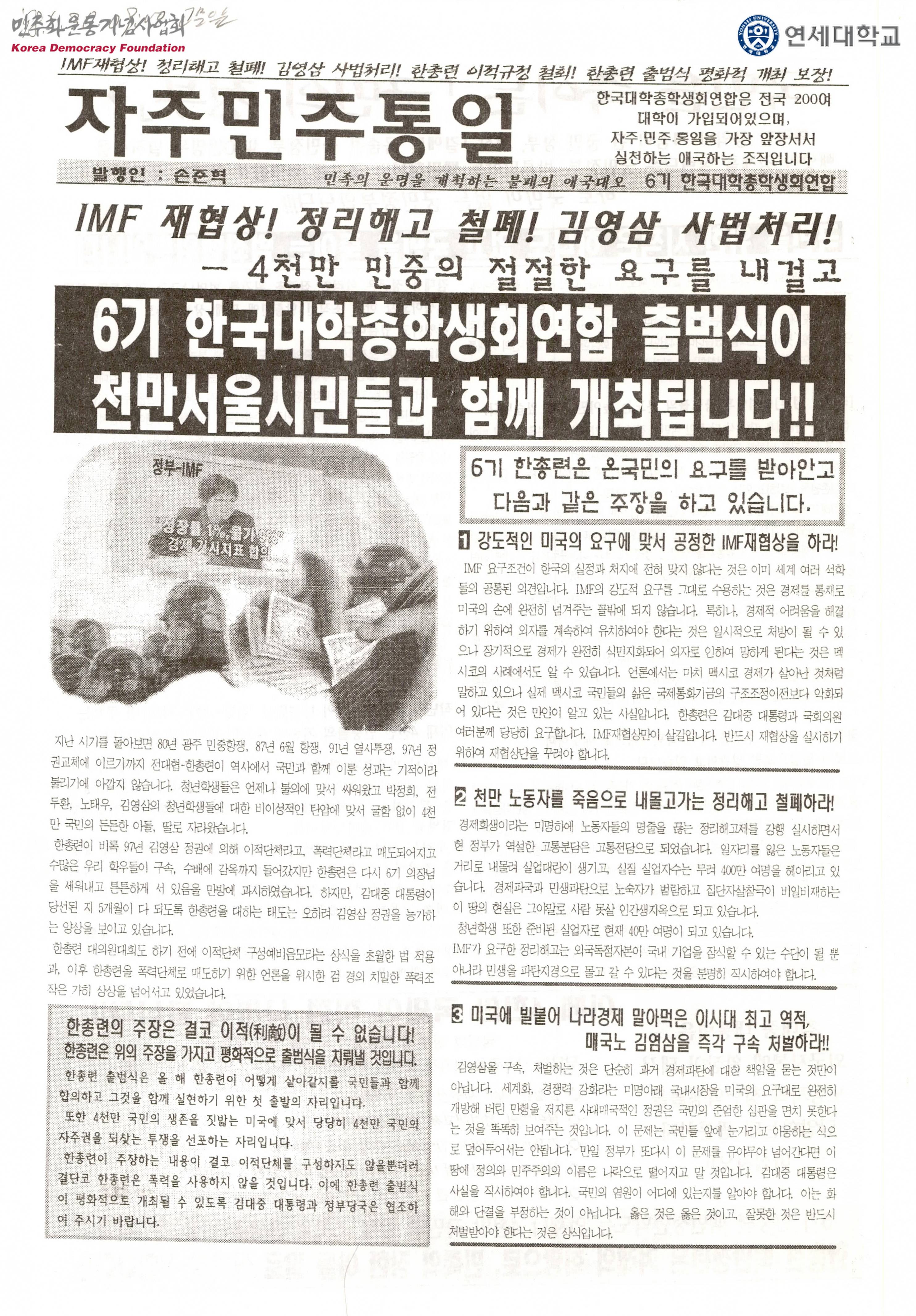 - 6기 한국대학총학생회연합 출범식이 천만서울시민들과 함께 개최된다는 내용, 6기 한총련의 '강도적인 미국의 요구에 맛서 공정한 IMF재협상을 하라', '천만 노동자를 죽음으로 내몰고가는 정리해고 철폐하라', '미국에 빌붙어 나라경제 말아먹은 이시대 최고 역적, 매국노 김영삼을 즉각 구속 처벌하라' 등의 주장이 수록된 유인물