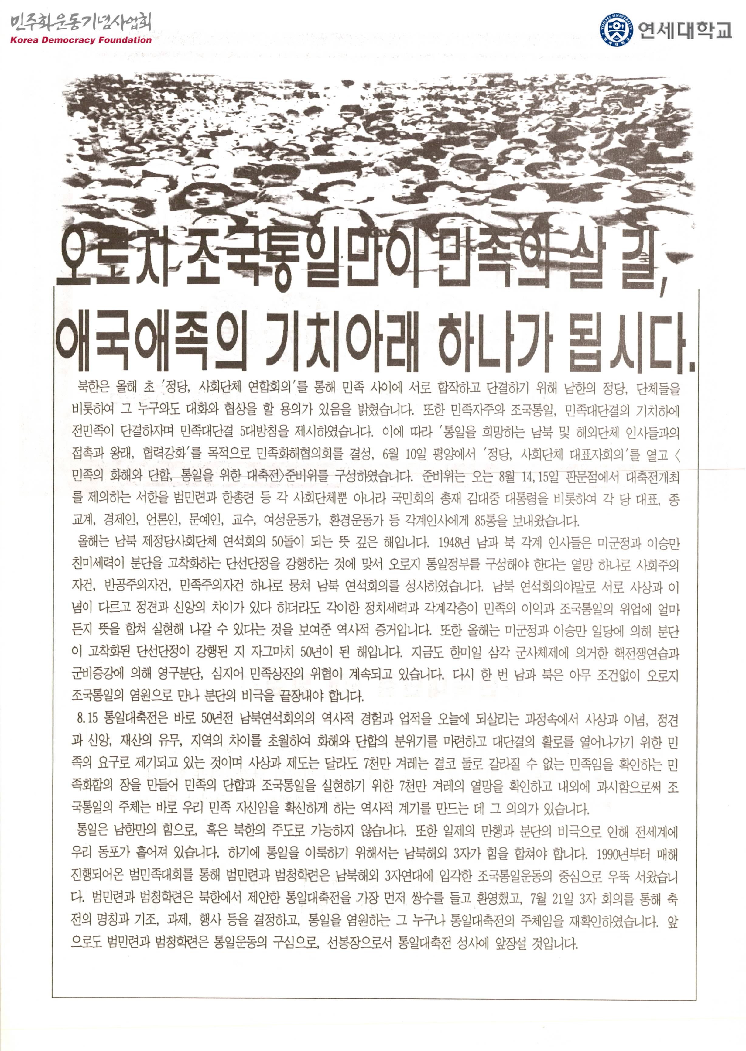 - 통일은 남한만의 힘 또는 북한의 주도로 가능하지 않으며 남북해외 3자가 힘을 합쳐야 가능하다는 내용, 앞으로도 범민련과 범청학련은 통일운동의 구심으로 선봉으로서 통일대축전 성사에 앞장설 것이라는 내용 등이 수록된 민족의 화해와 단합, 통일을 위한 신촌지역 통일대축전 유인물