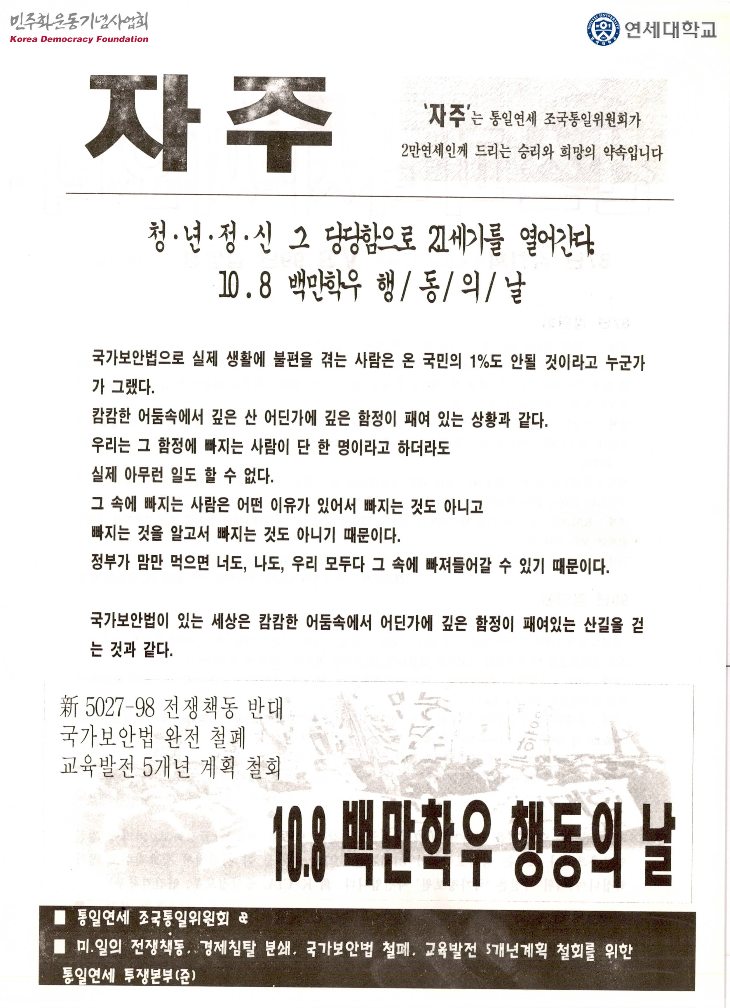 자주 : 청년정신 그 당당함으로 21세기를 열어간다. 10.8 백만학우 행동의날