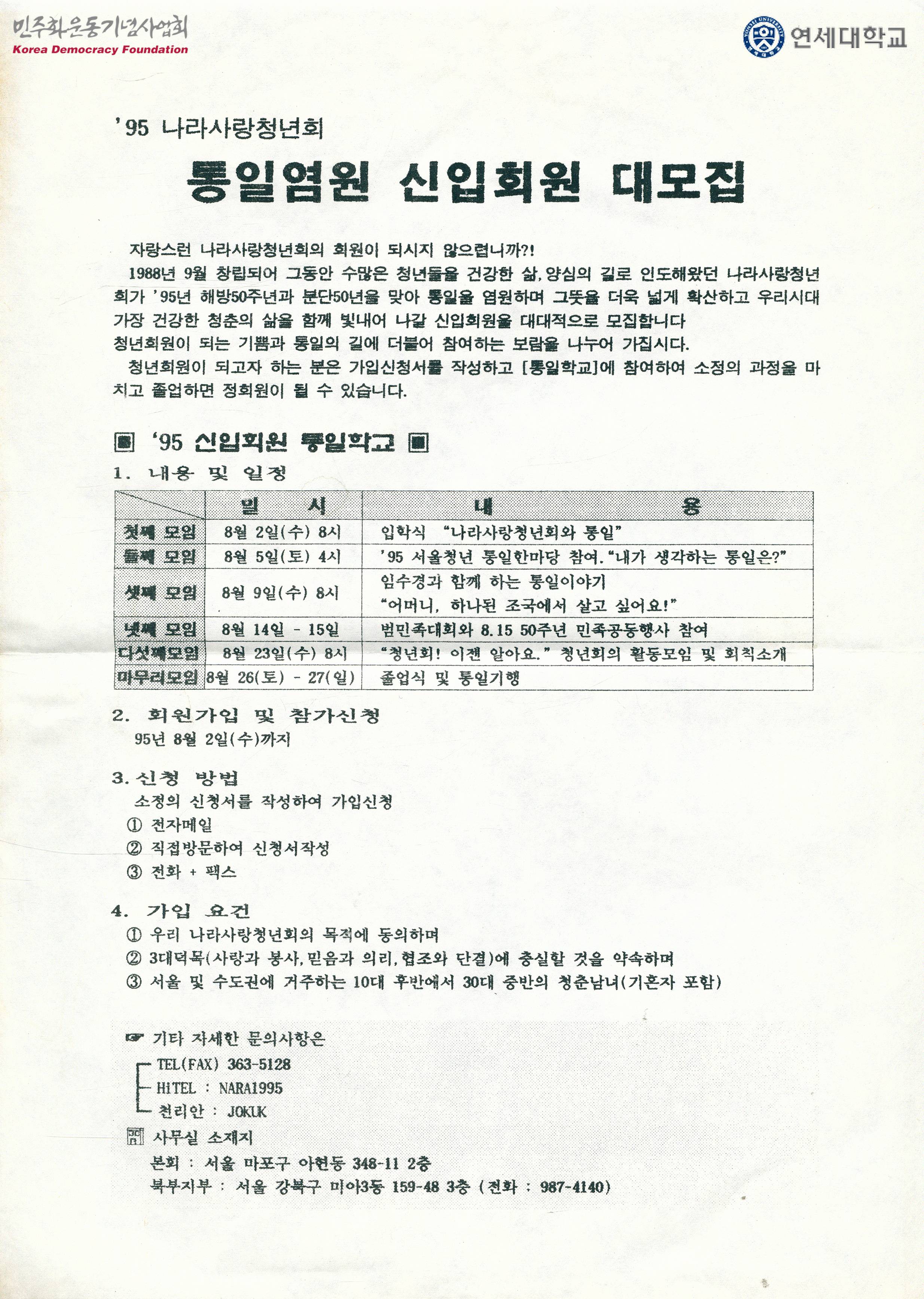 - 1995 신입회원 통일학교의 내용 및 일정, 회원 가입 및 참가 신청 기한, 참가 신청 방법, 가입 요건, 문의사항 문의처 등의 내용이 수록된 유인물