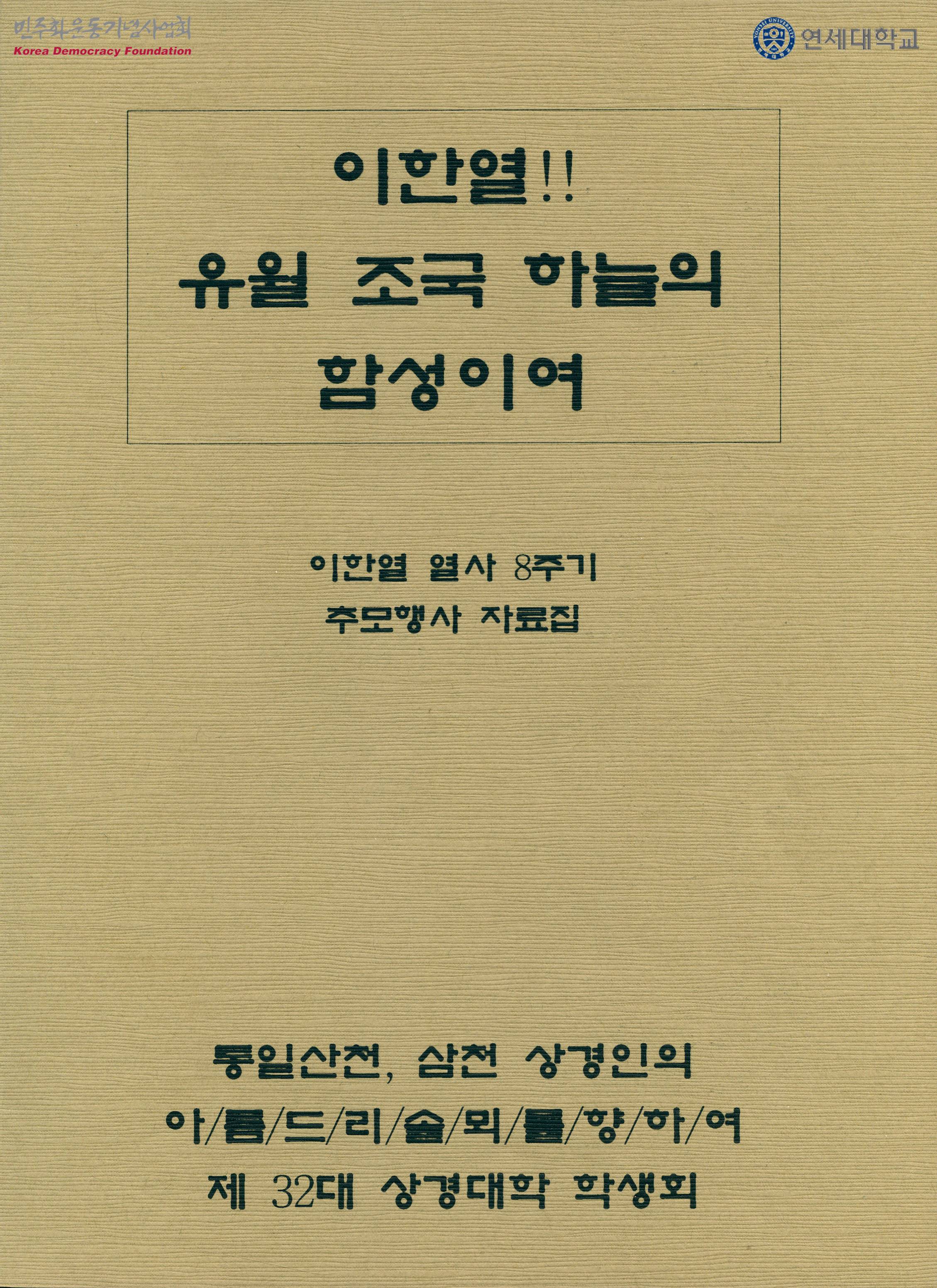 - 이한열 열사의 시, 동지를 위하여 노래 악보 등의 내용이 수록된 문서로 목차는 다음과 같음 -유고시 -상경대 학생회장 인사말 -이한열 열사 약력 -열사가 남기고 간 글 모음 -열사에게 보내는 글 모음 -기획글 -노래