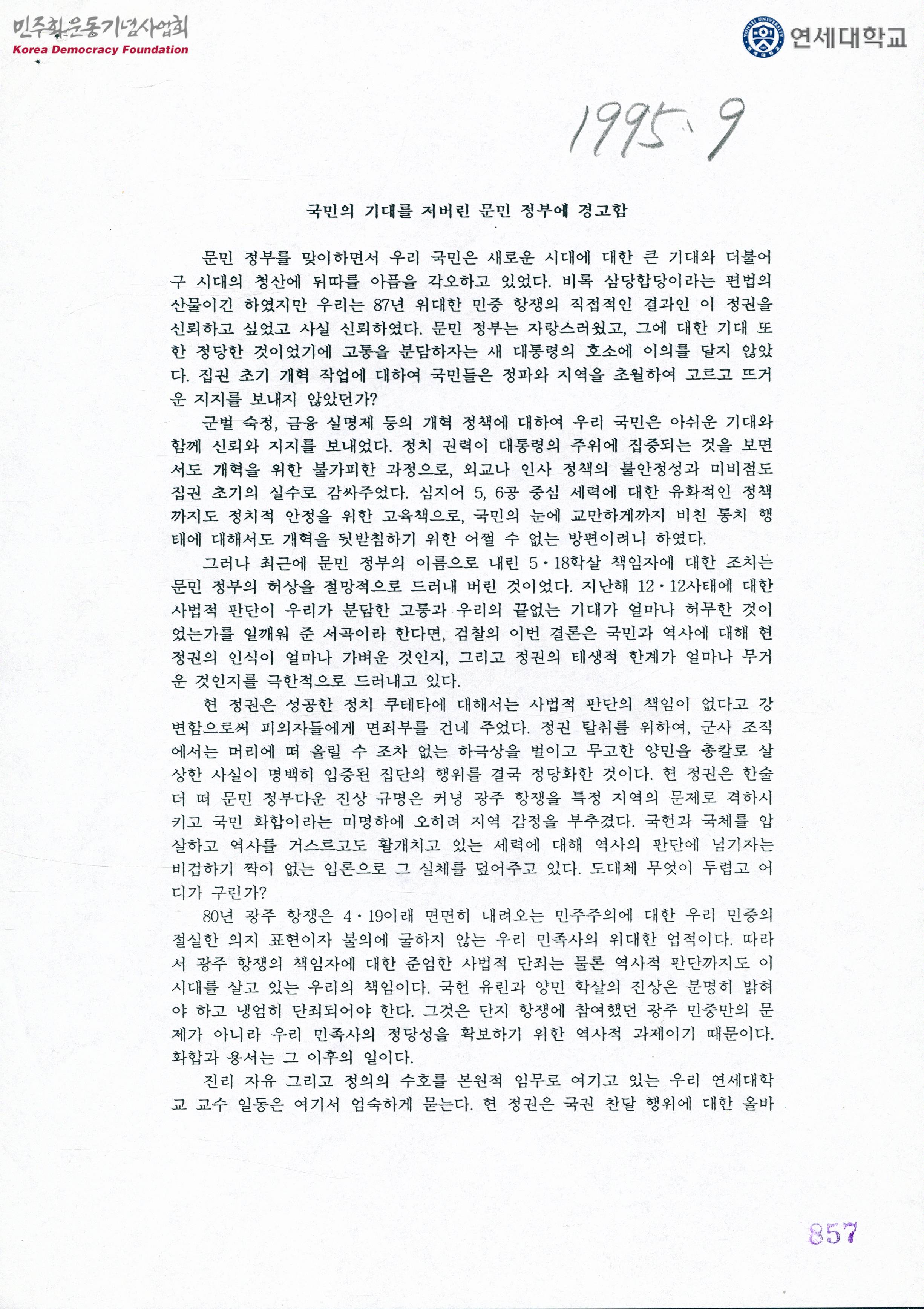 - 문민 정부의 5·18 학살 책임자에 대한 조치, 5·18 기소 불가에 대한 비판, 서명 교수의 명단 등의 내용이 수록된 문서