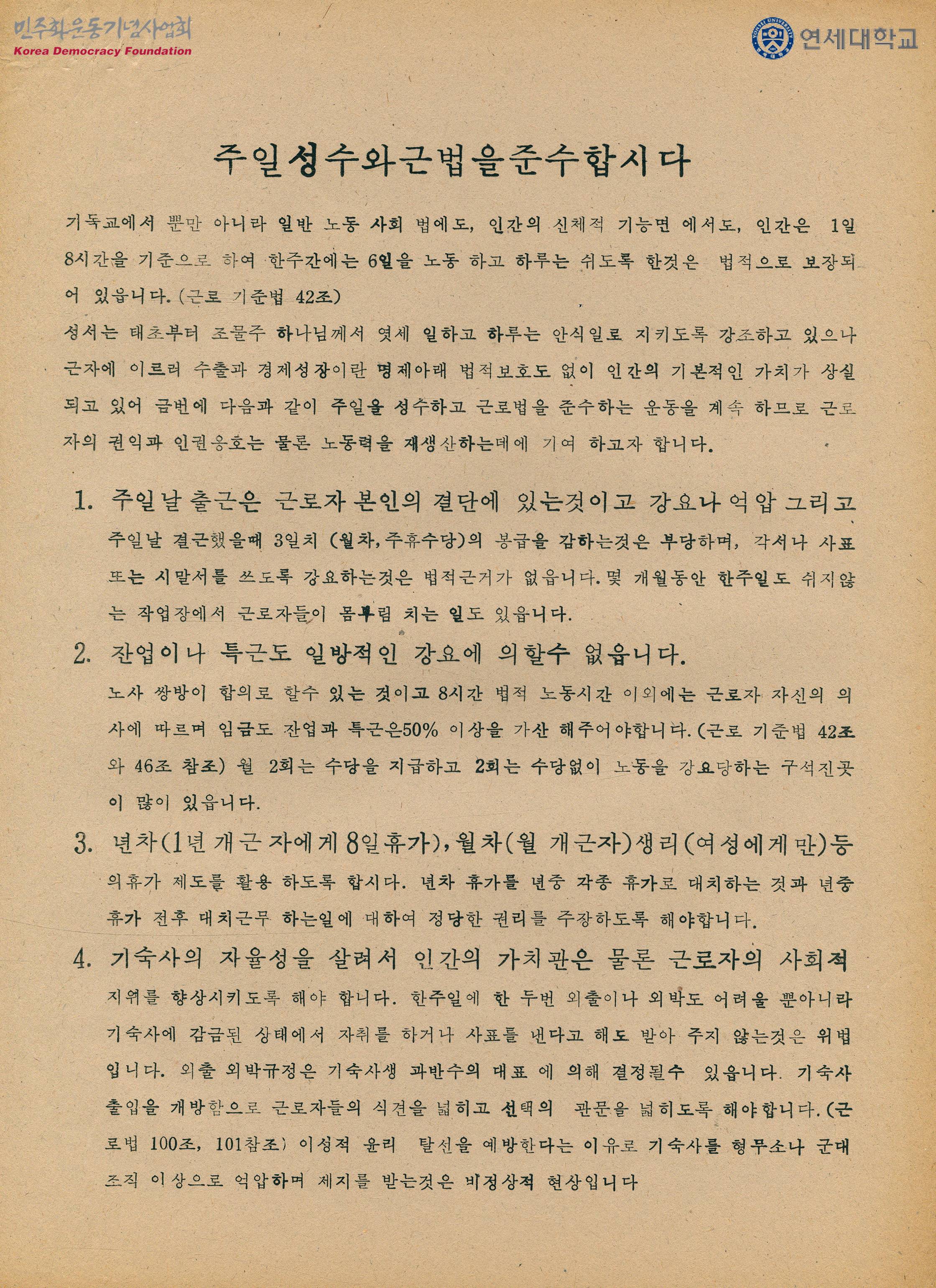- 주일을 성수하고 근로법을 준수하는 운동의 목표, 주일날 출근과 특근 강요의 문제 등의 내용이 수록된 문서
