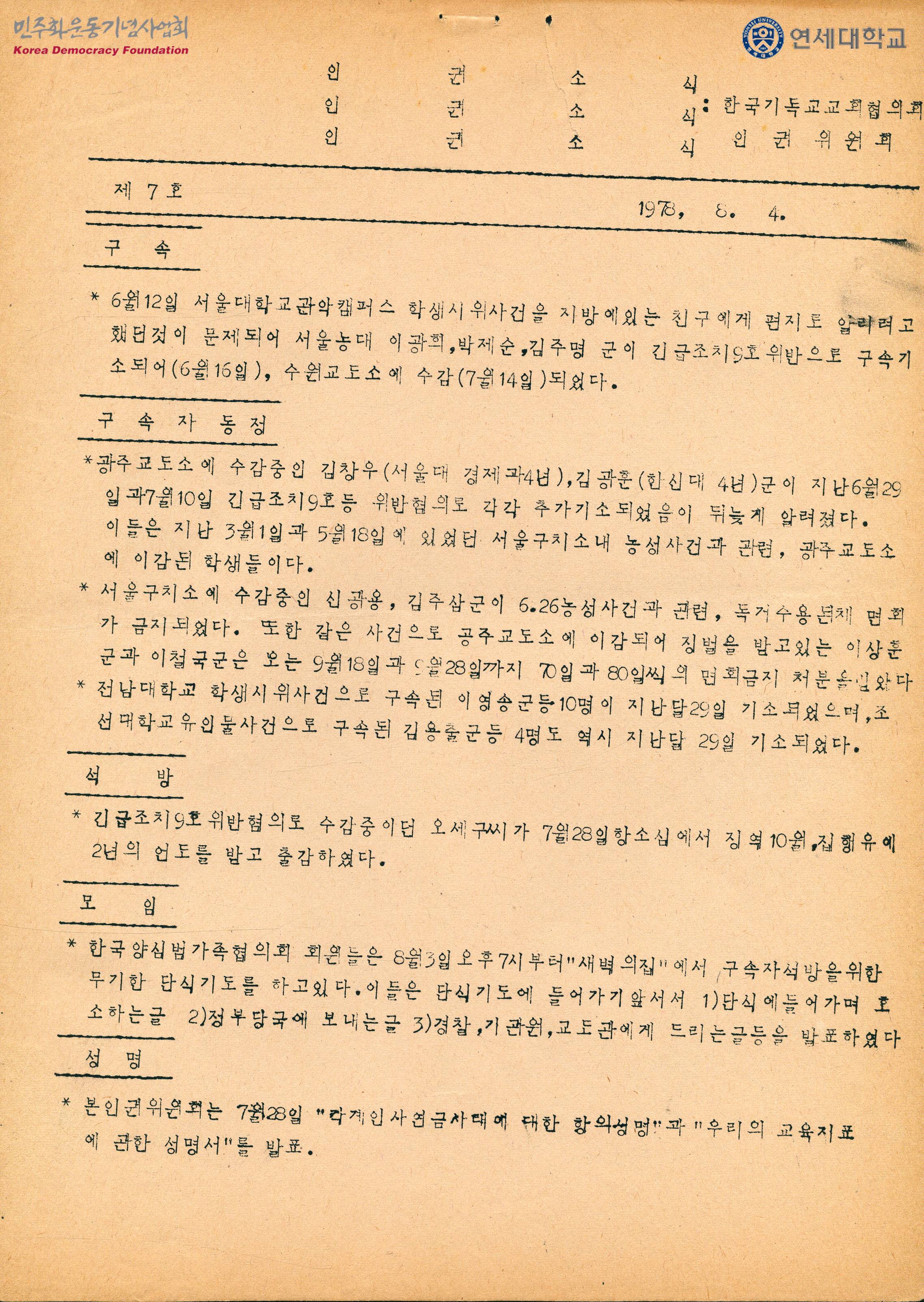 - 각계 인사 연금사태에 대한 항의 성명 및 우리의 교육지표에 관한 성명서 발표 등의 내용이 수록된 문서로 목차는 다음과 같음 -구속 -구속자 동정 -석방 -모임 -성명 -공판일지 -안내