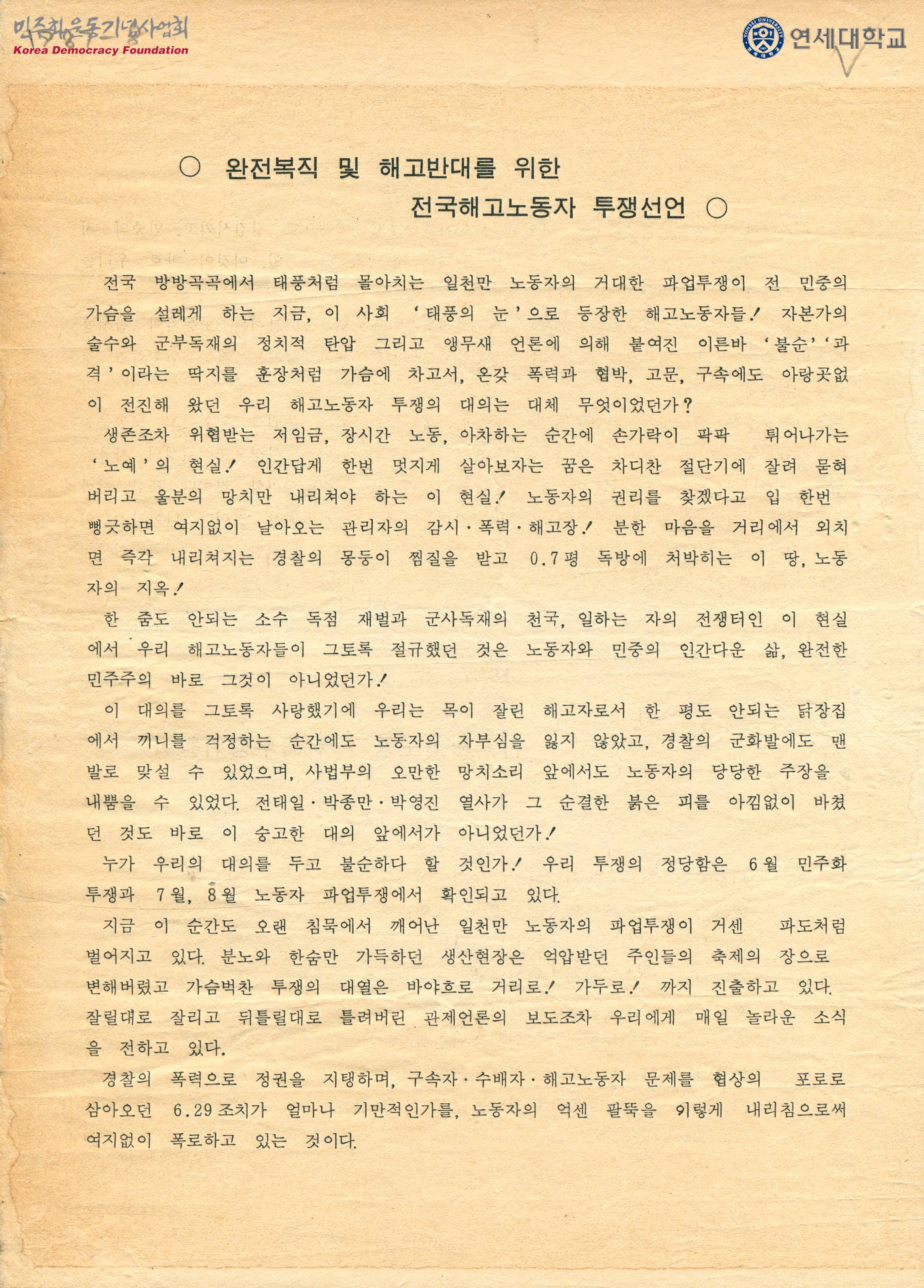 완전복직 및 해고반대를 위한 전국해고노동자 투쟁선언