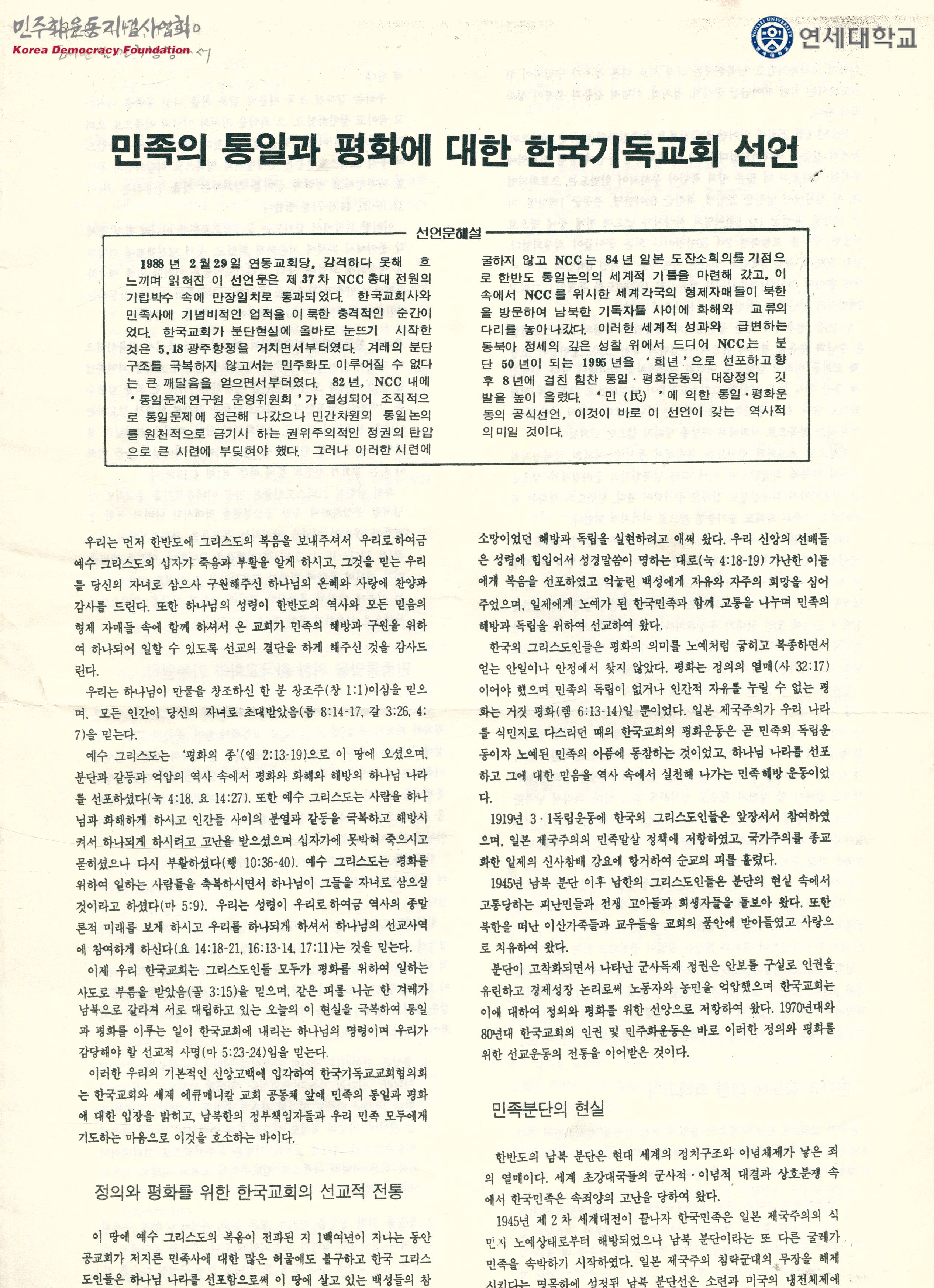 - 한국기독교회선언 선언문 해설, 민족의 통일과 평화에 대한 입장이 수록된 문서로 목차는 다음과 같음 -정의와 평화를 위한 한국교회의 선교적 전통 -민족분단의 현실 -분단과 증오에 대한 죄책고백 -민족통일을 위한 한국교회의 기본원칙 -남북한 정부에 대한 한국교회의 건의 -평화와 통일을 위한 한국교회의 과제