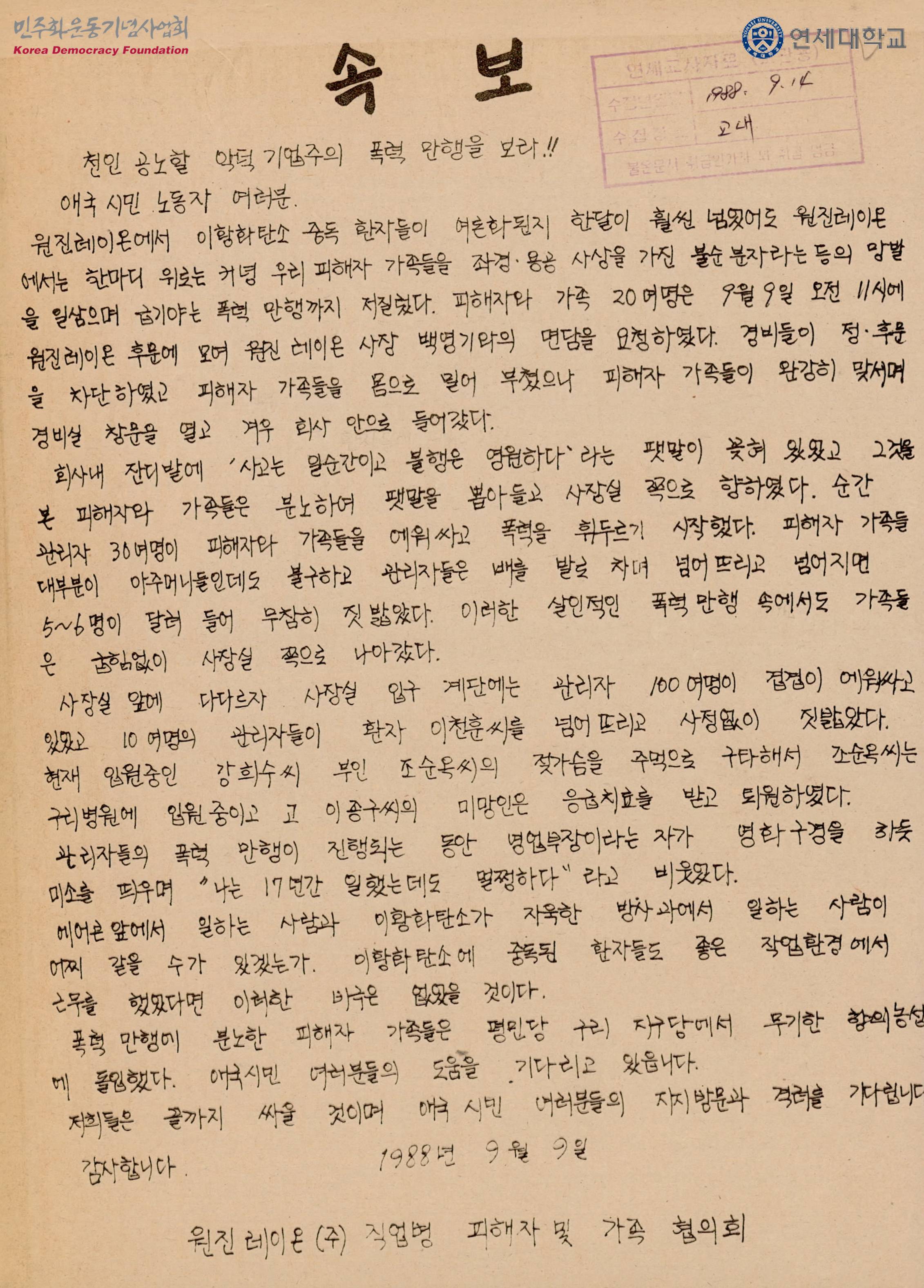 - 원진레이온 직업병으로 인한 피해자, 피해자 가족의 무기한 항의농성 돌입 등의 내용이 수록된 문서