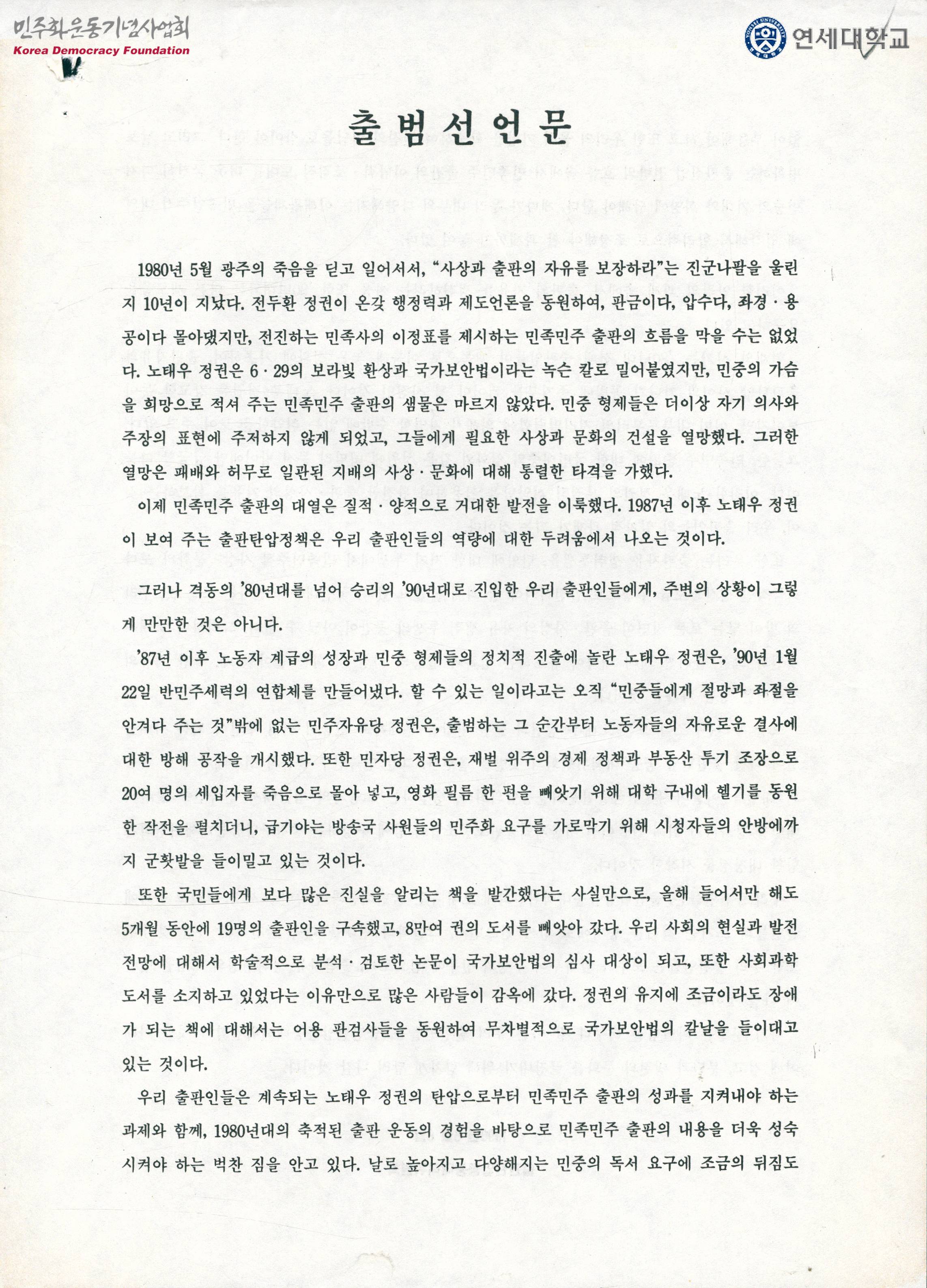- 1990년 출판인에게 닥친 현실, 출판자유 쟁취투쟁의 발전 과제, 출판자유 쟁취투쟁 다짐 등의 내용이 수록된 문서
