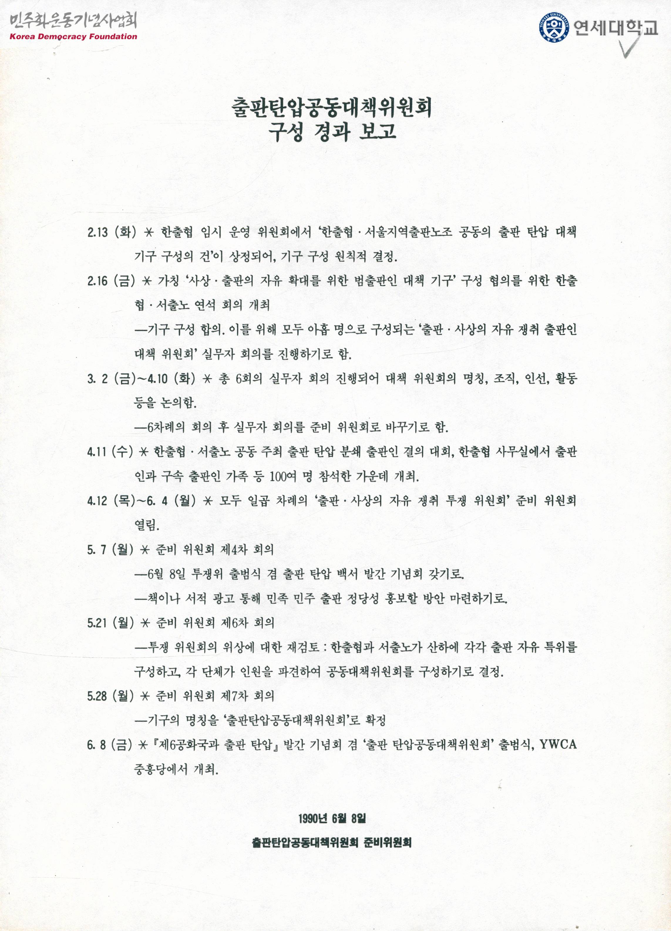 - 2월 13일부터 6월 8일까지 출판탄압공동대책위원회 준비위원회의 결성과정이 수록된 문서