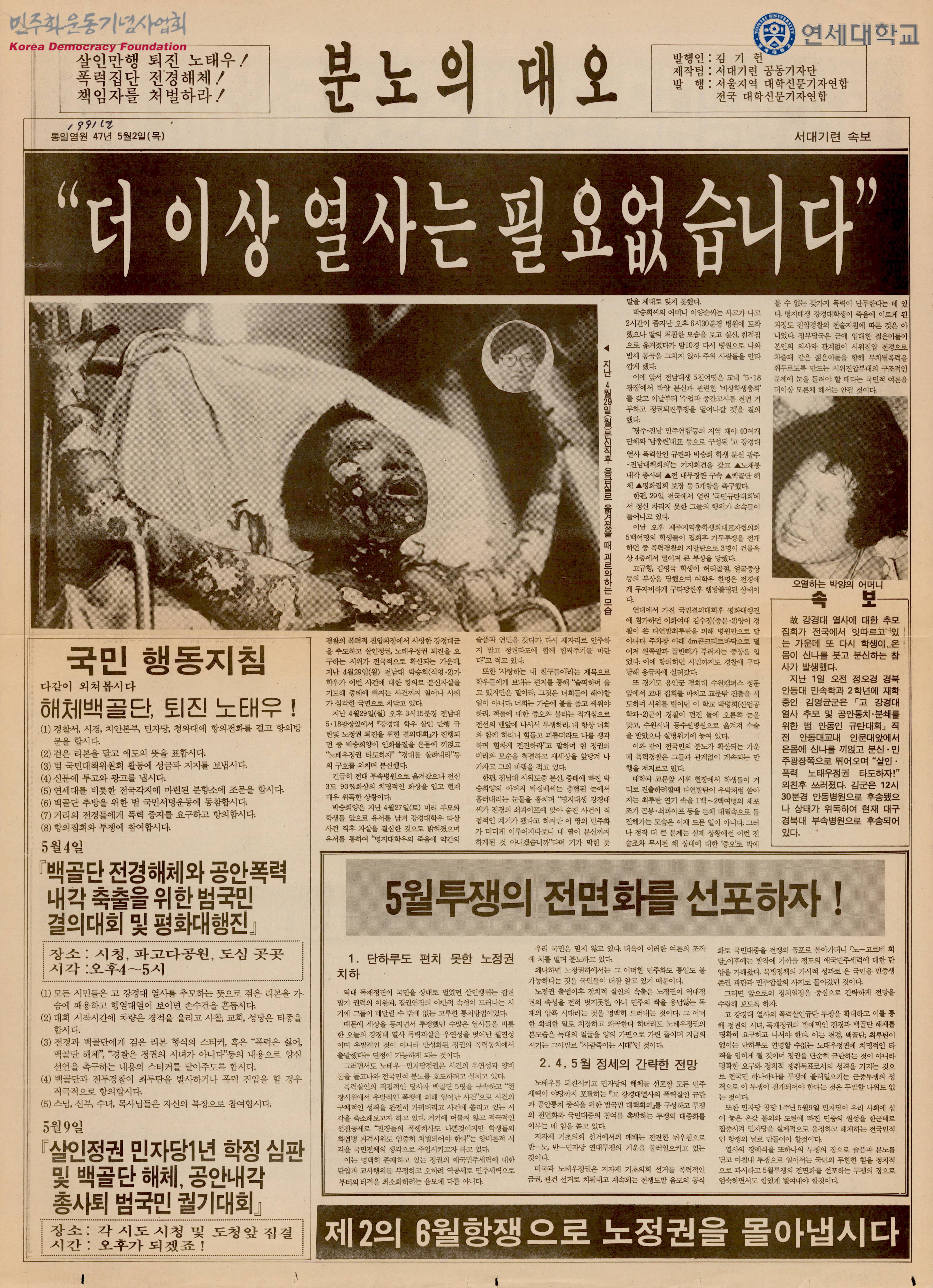 - 전남대 5·18광장에서 진행된 강경대 학우 살인 만행 규탄 및 노정권 퇴진을 위한 결의대회 당시 박승희의 분신, 나윤성의 양심선언, 노태우 정권 퇴진 관련 성명 등의 내용이 수록된 문서