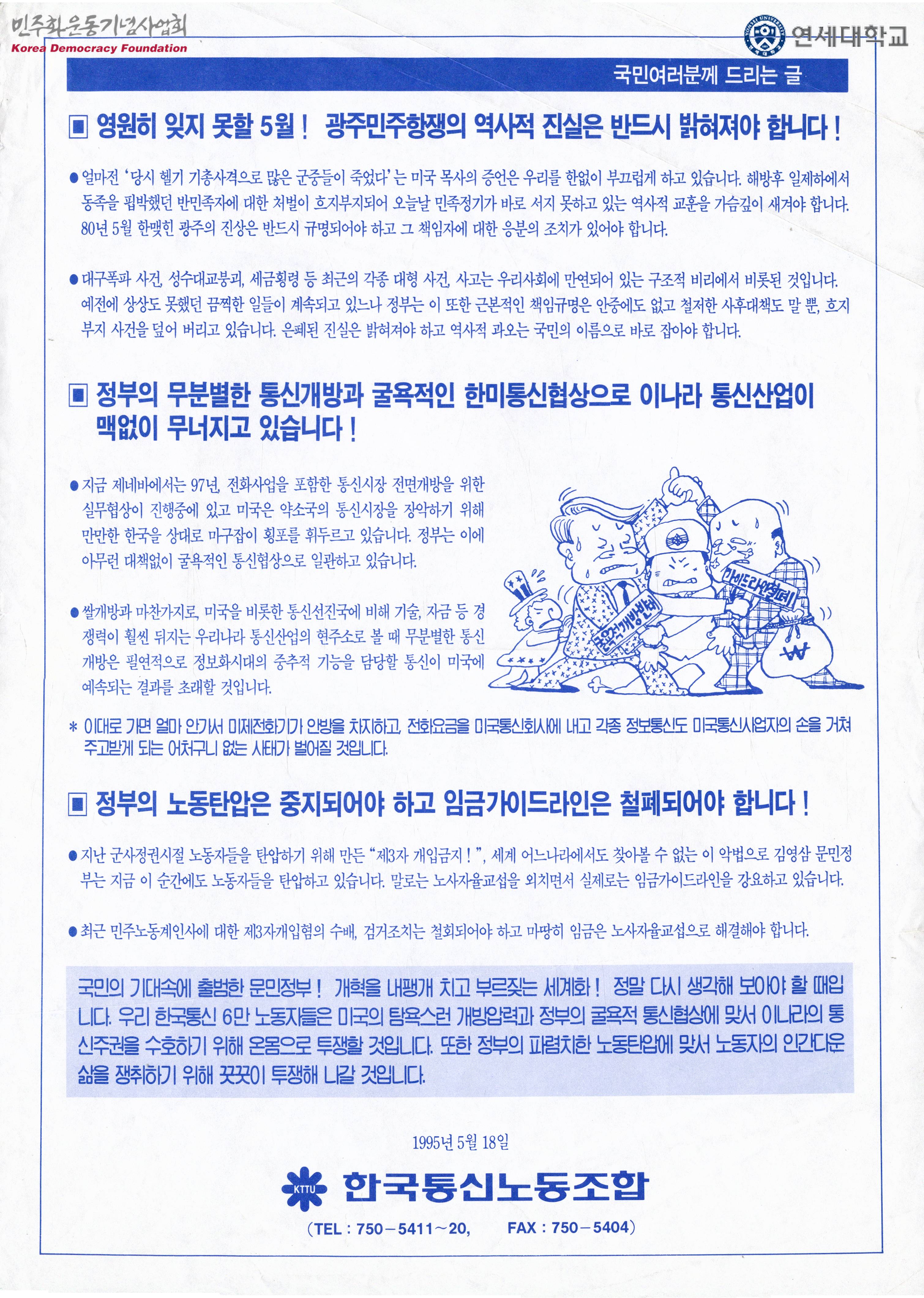 - 광주민주항쟁의 진상 규명 및 책임자에 대한 조치의 필요성, 정부의 무분별한 통신개방과 한미통신협상의 문제점, 노통탄압 중지 및 임금가이드라인 철폐 주장 등의 내용이 수록된 문서