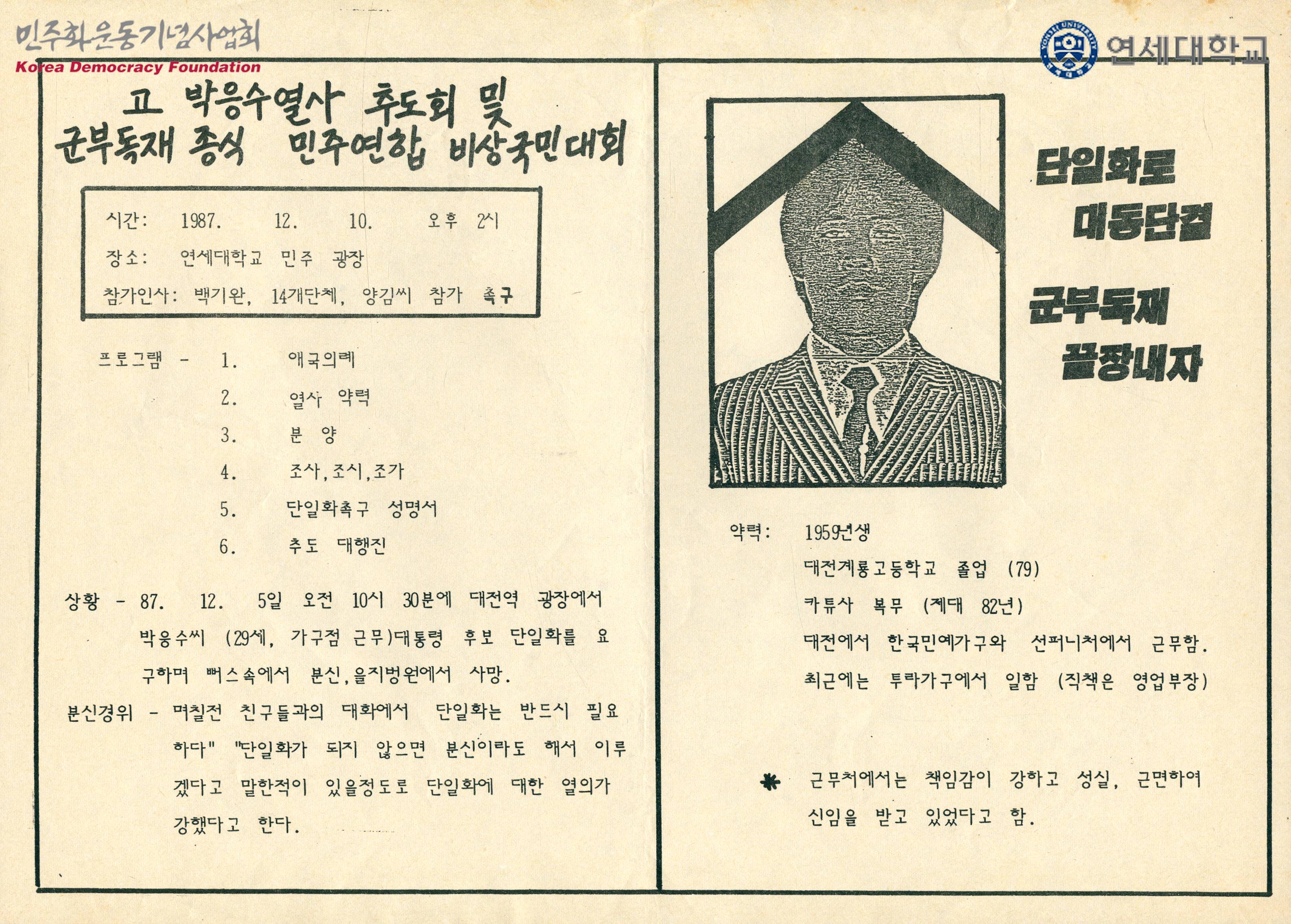 - 박응수 열사의 약력, 고 박응수 열사 추도회 및 군부독재 종식 민주연합 비상국민대회의 일시, 장소, 프로그램 순서, 분신 경위 등의 내용이 수록된 문서