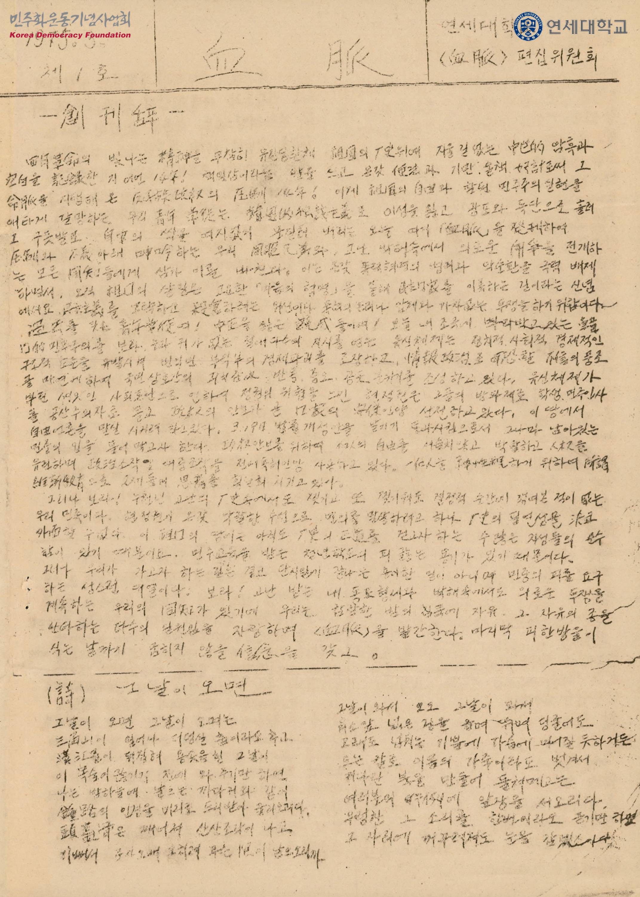 - 전국민주청년학생총연맹에 대한 용공조작 사건의 내용이 담긴 정간물로 목차는 다음과 같음 -창간사 -사설 개혁은 뿌리부터! -한국민중운사 -희대의 조작극 민청학련 -민주주의의 배신