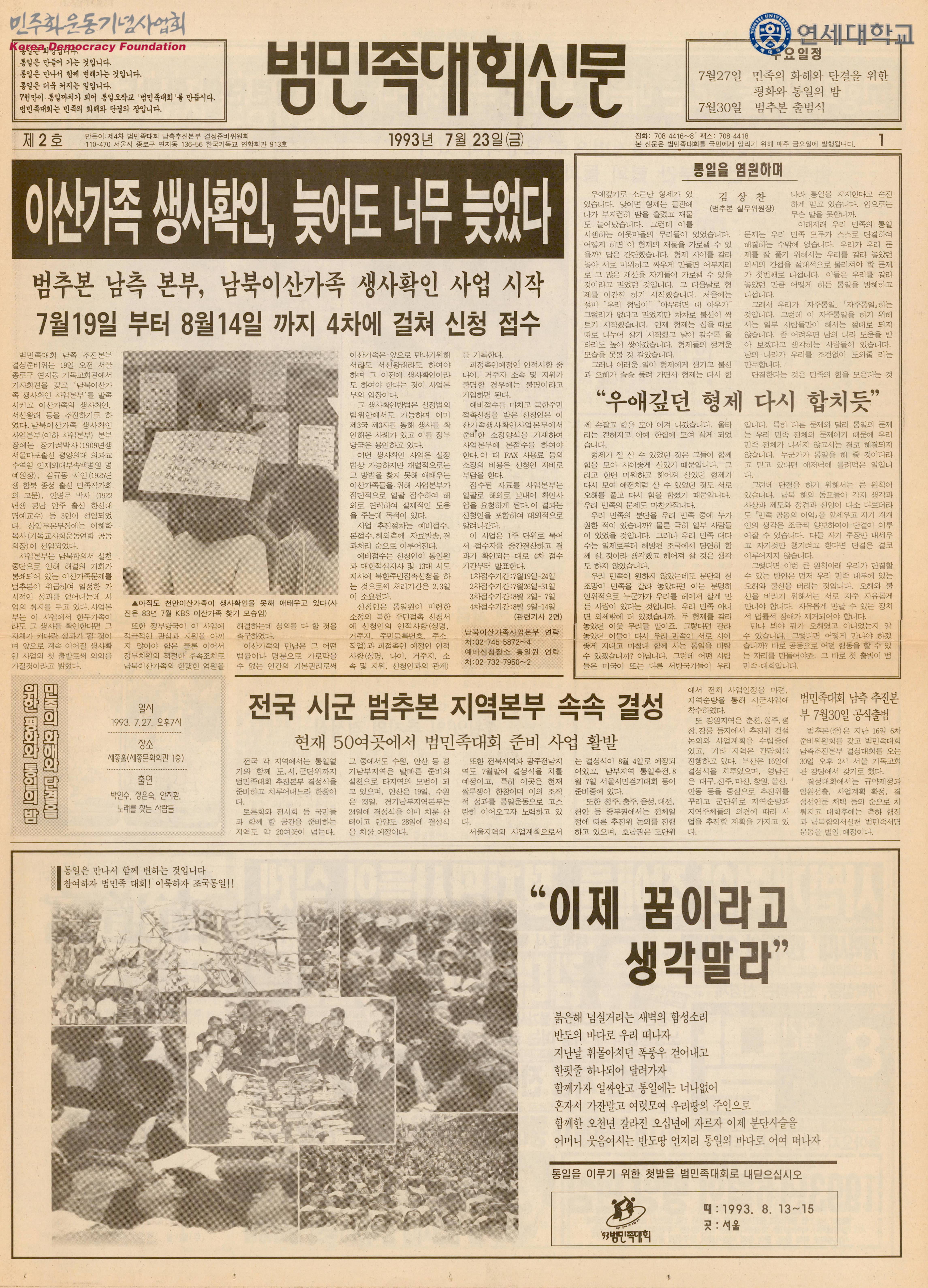 - 이산가족과 범국민대회 준비 내용이 담긴 정간물로 수록된 글은 다음과 같음 -이산가족 생사확인, 늦어도 너무 늦었다 -전국 시군 범추본 지역본부 속속 결성 -고향과 가족을 그리는 마음이 분단의 벽을 허문다 -클린턴의 한반도 정책