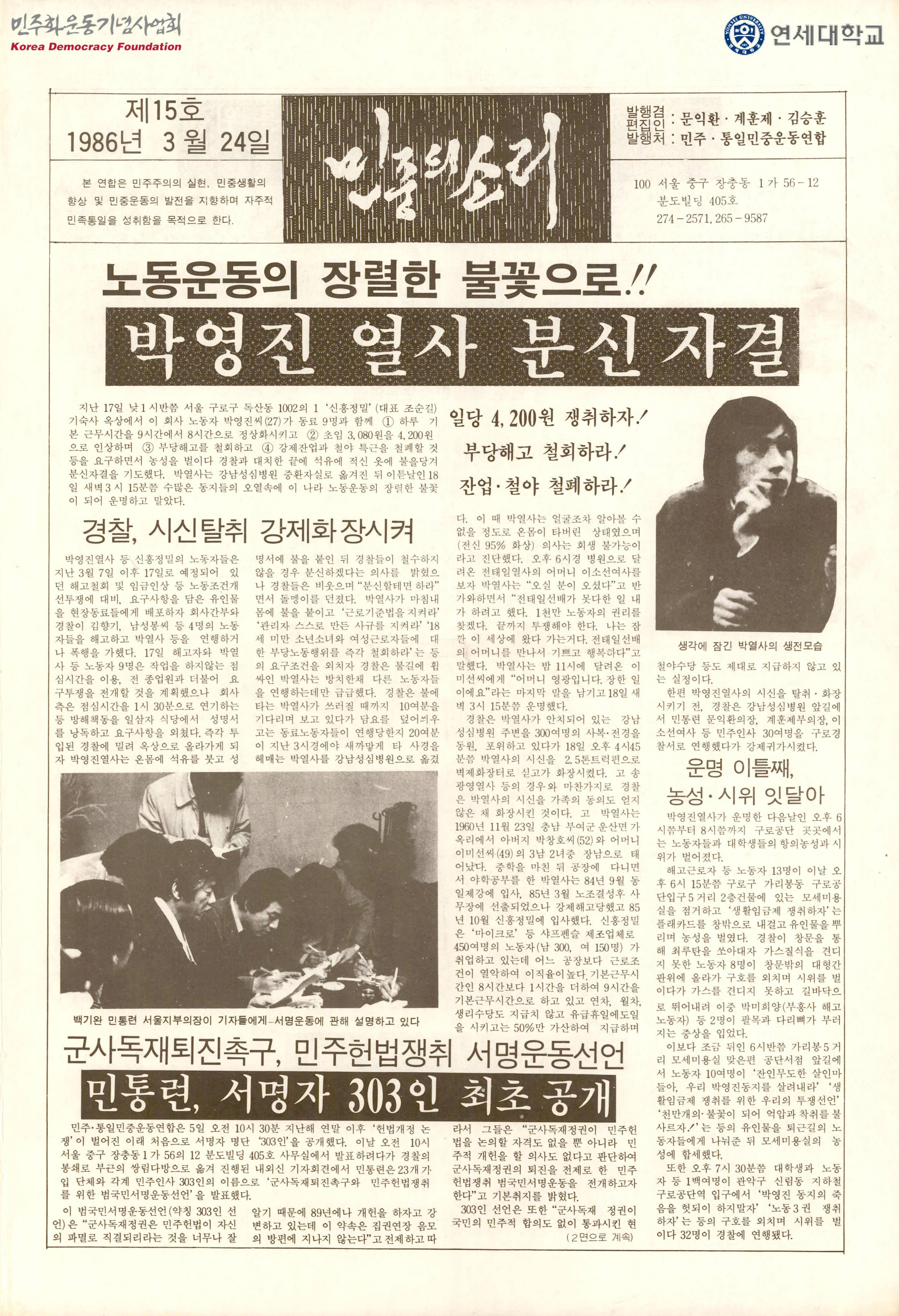 - 박영진 열사의 분신과 구로지역 노동자들의 항쟁 등의 내용이 담긴 정간물로 수록된 글은 다음과 같음 -노동운동의 장렬한 불꽃으로!! 박영진 열사 분신자결 -민통련, 서명자 303인 최초 공개 -군사독재 퇴진촉구와 민주헌법쟁취를 위한 범국민 서명운동선언 -개헌 "빠를수록 좋은 것" -이 죽음과 통곡 앞에서 이젠 우리 결단해야 한다! -경인·구로지역 노동자 거센 항쟁