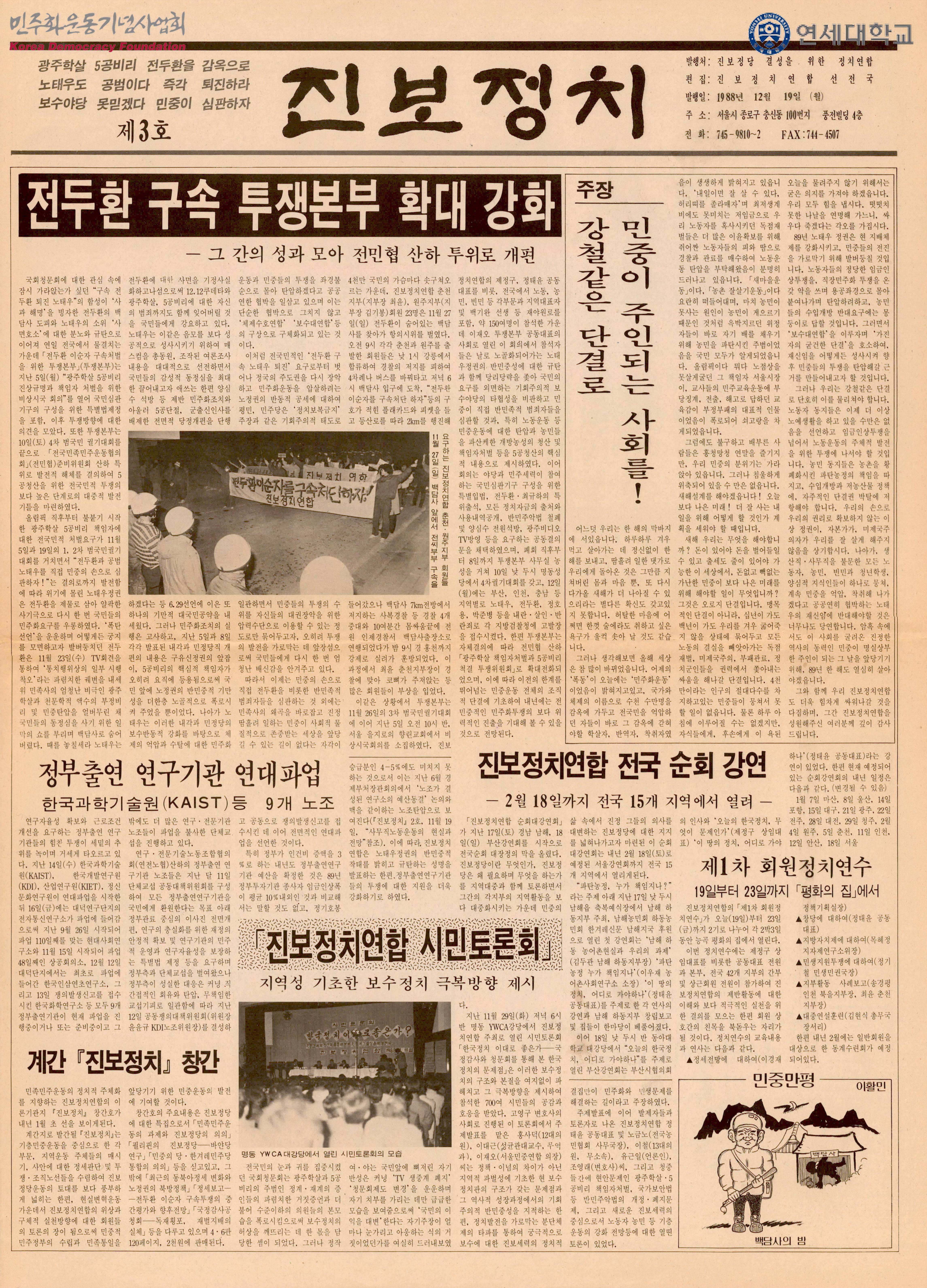 - 전보정치연합의 전국 순회 강연과 전두환 구속 투쟁 등의 내용을 다룬 정간물로 수록된 글은 다음과 같음 -전두환 구속 투쟁본부 확대 강화 -정부출연 연구기관 연대파업 -진보정치연합 전국 순회 강연 -특집Ⅰ 88년이 남긴 성과와 과제 -특집Ⅱ 송년 좌담 89년 민중운동의 발전을 전망한다