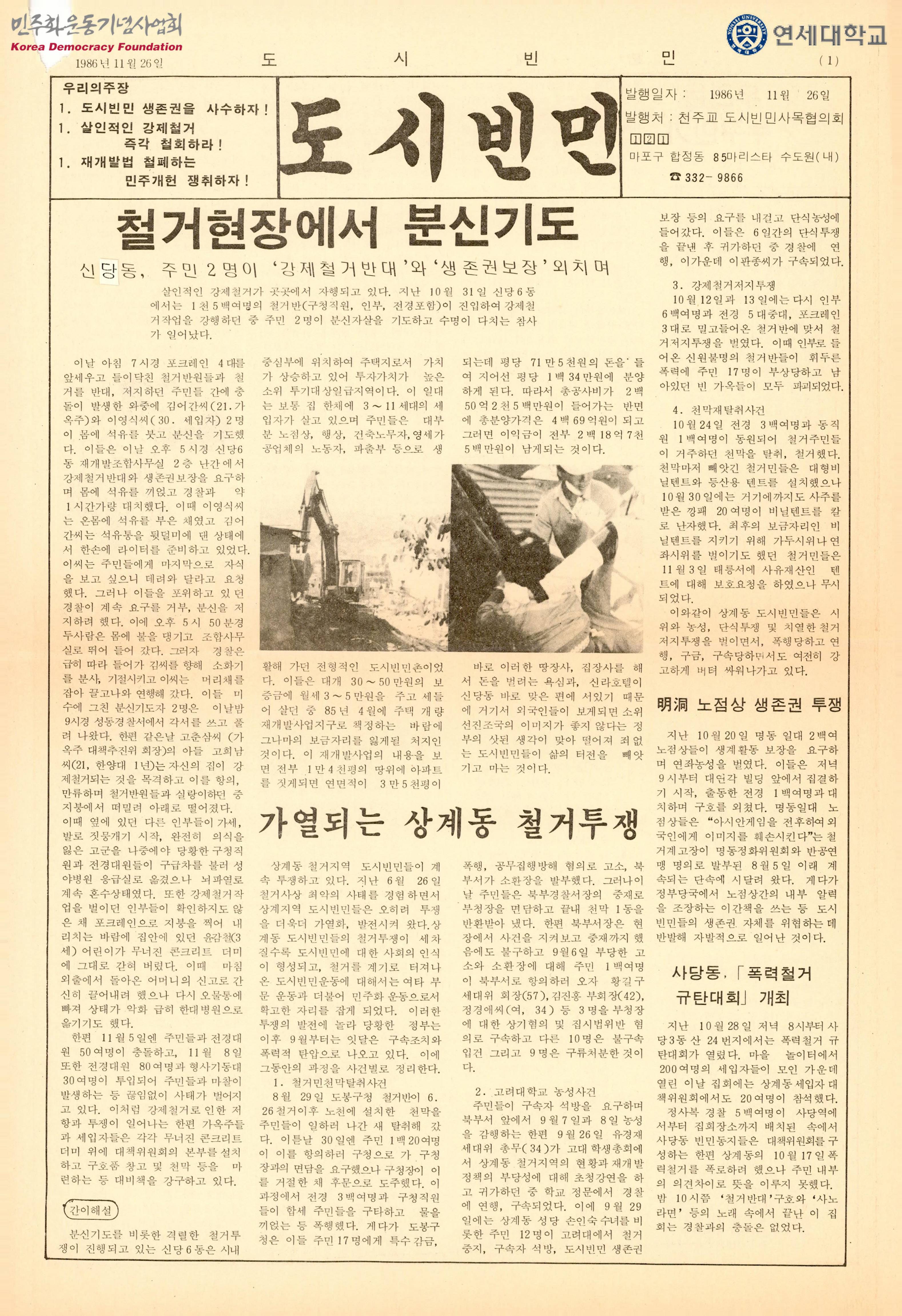 - 상계동 철거와 도시빈민운동 등의 내용을 다룬 정간물로 수록된 글은 다음과 같음 -철거현장에서 분신기도 -가열되는 상계동 철거투쟁 -우리는 누구인가 -86 상반기 도시빈민운동일지 -입주권은 미끼에 불과했다! -현장의 소리 -"옛날대로 여기 사는 거요"