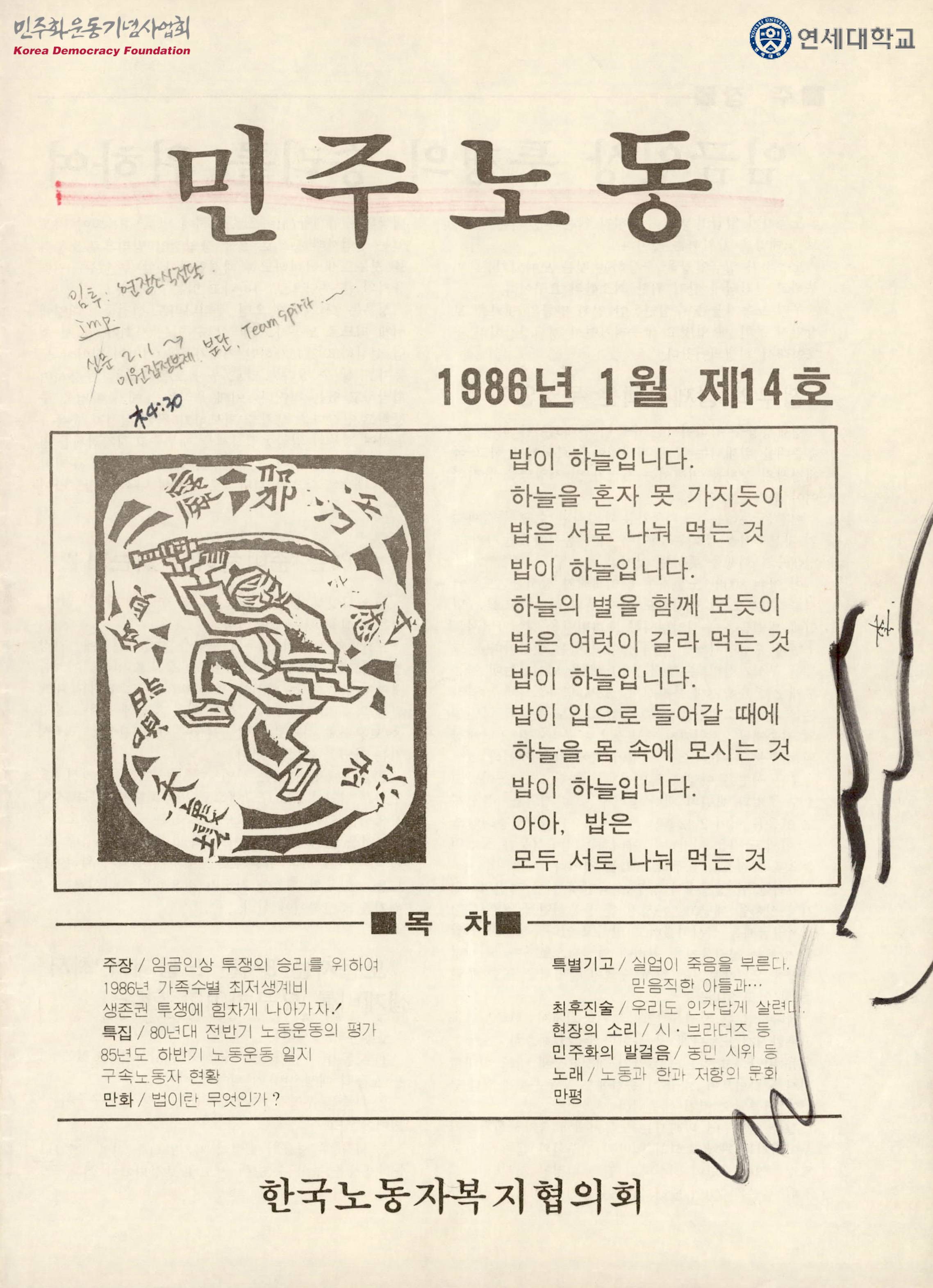 - 최저생계비와 임금인상투쟁에 대한 내용을 다룬 정간물로 목차는 다음과 같음 -주장 : 임금인상 투쟁의 승리를 위하여 -1986년 가족수별 최저생계비 생존권 투쟁에 힘차게 나아가자! -특집 : 80년대 전반기 노동운동의 평가 -85년도 하반기 노동운동 일지 -구속노동자 현황 -만화 : 법이란 무엇인가? -특별기고 : 실업이 죽음을 부른다, 믿음직한 아들과… -최후진술 : 우리도 인간답게 살련다 -현장의 소리 : 시·브라더즈 등 -민주화의 발걸음 : 농민 시위 등 -노래 : 노동과 한과 저항의 문화 -만평