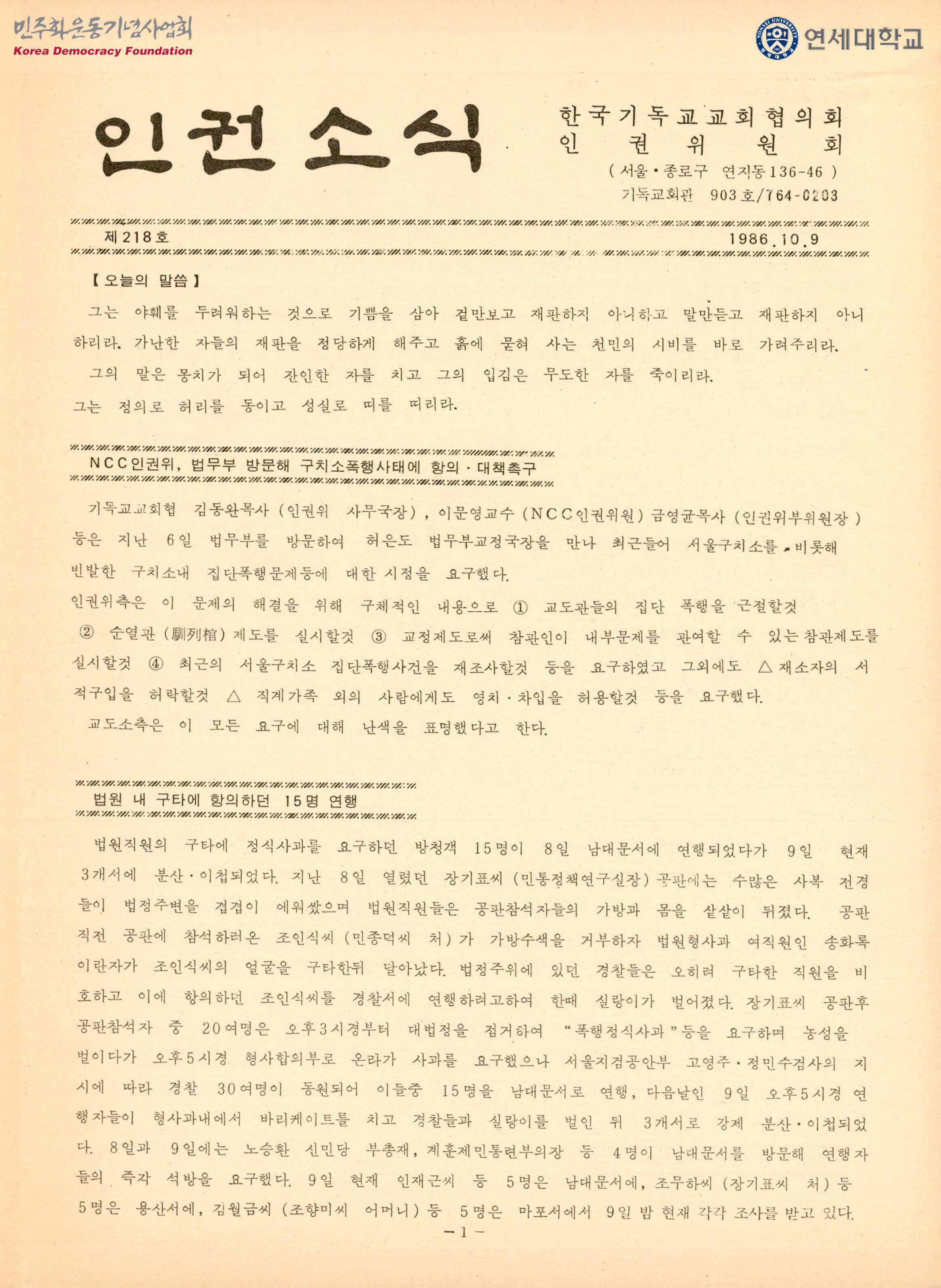 - NCC인권위원회가 법무부에 방문해 구치소 폭행사건에 대한 항의와 대책을 촉구한 내용, 민주교육탄압 저지위원회의 발족, 문익환 목사의 첫 공판, 무등양말 근로자 노조탄압에 대한 내용 등이 수록된 소식지