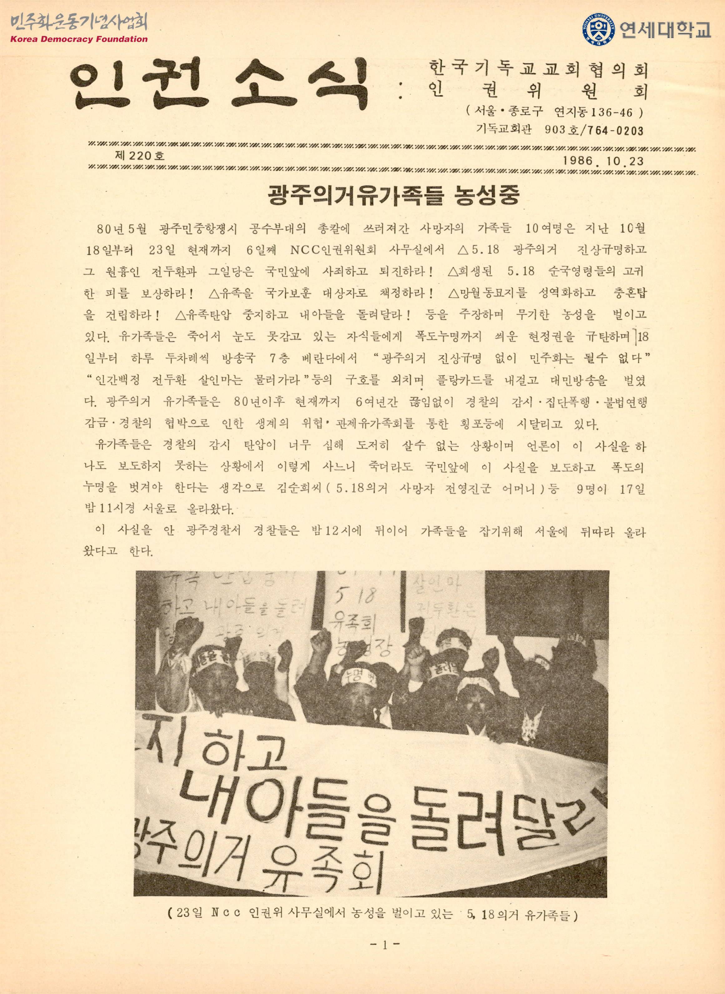 - 광주 항쟁의 유가족의 농성 소식, 유성환 의원이 국회 발언으로 수감되었다는 내용, 수배자 가족에 대한 탄압이 지속되고 있다는 내용, 인천소년교도소 40여명의 단식농성 내용 등이 수록된 소식지
