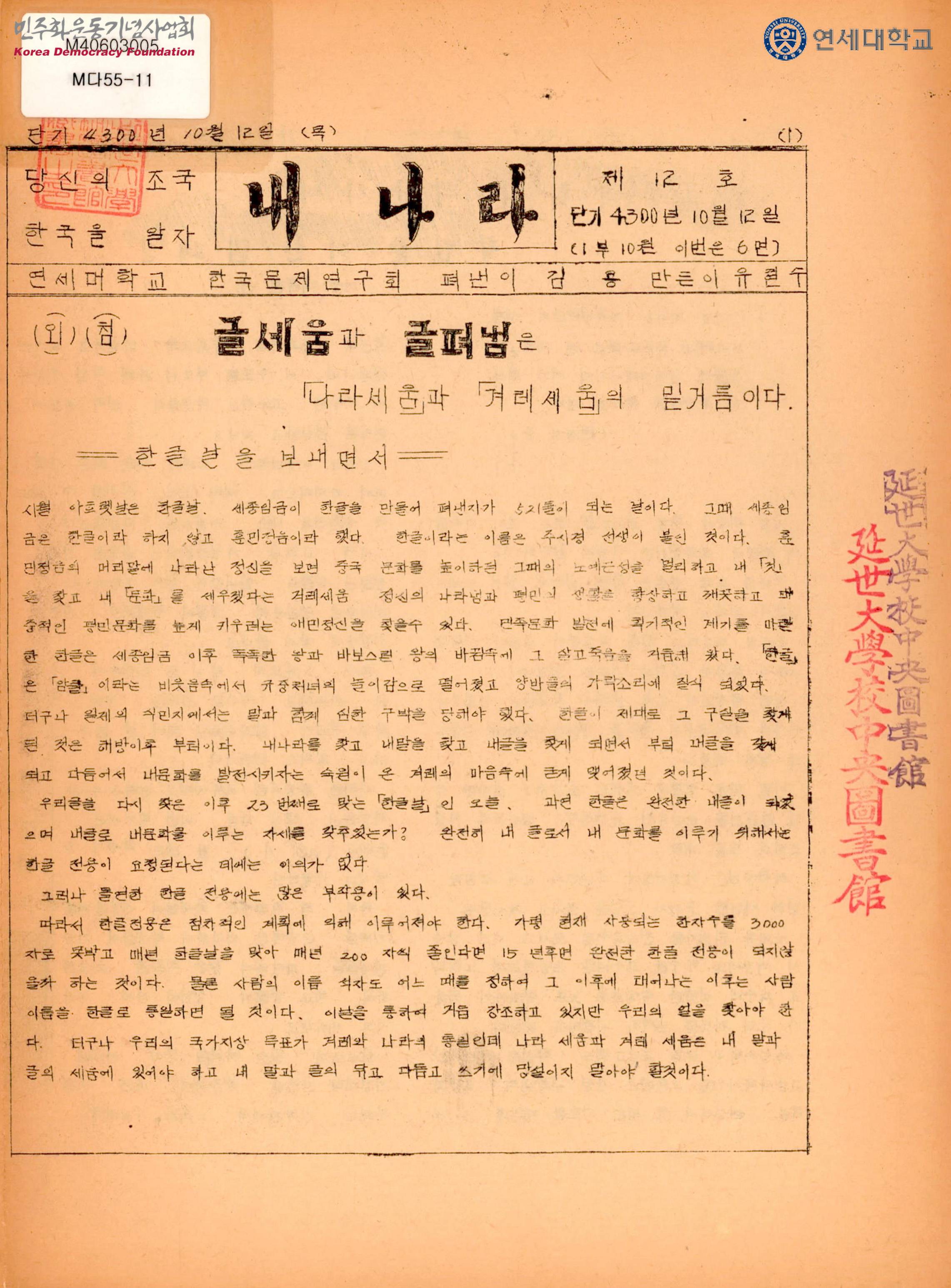 - 민족 문화 회복과 가정과 대학에서의 교풍 확립 등의 내용을 다룬 정간물로 다음과 같음 -글세움과 글펴냄은 나라세움과 겨레세움의 밑걸음이다 -교풍 확립과 학문자세 확립을 위한 캠페인 - 가정 대학편 -계절 수필 리레이 -선각자 순례 -한국경제순례2 -토막소식