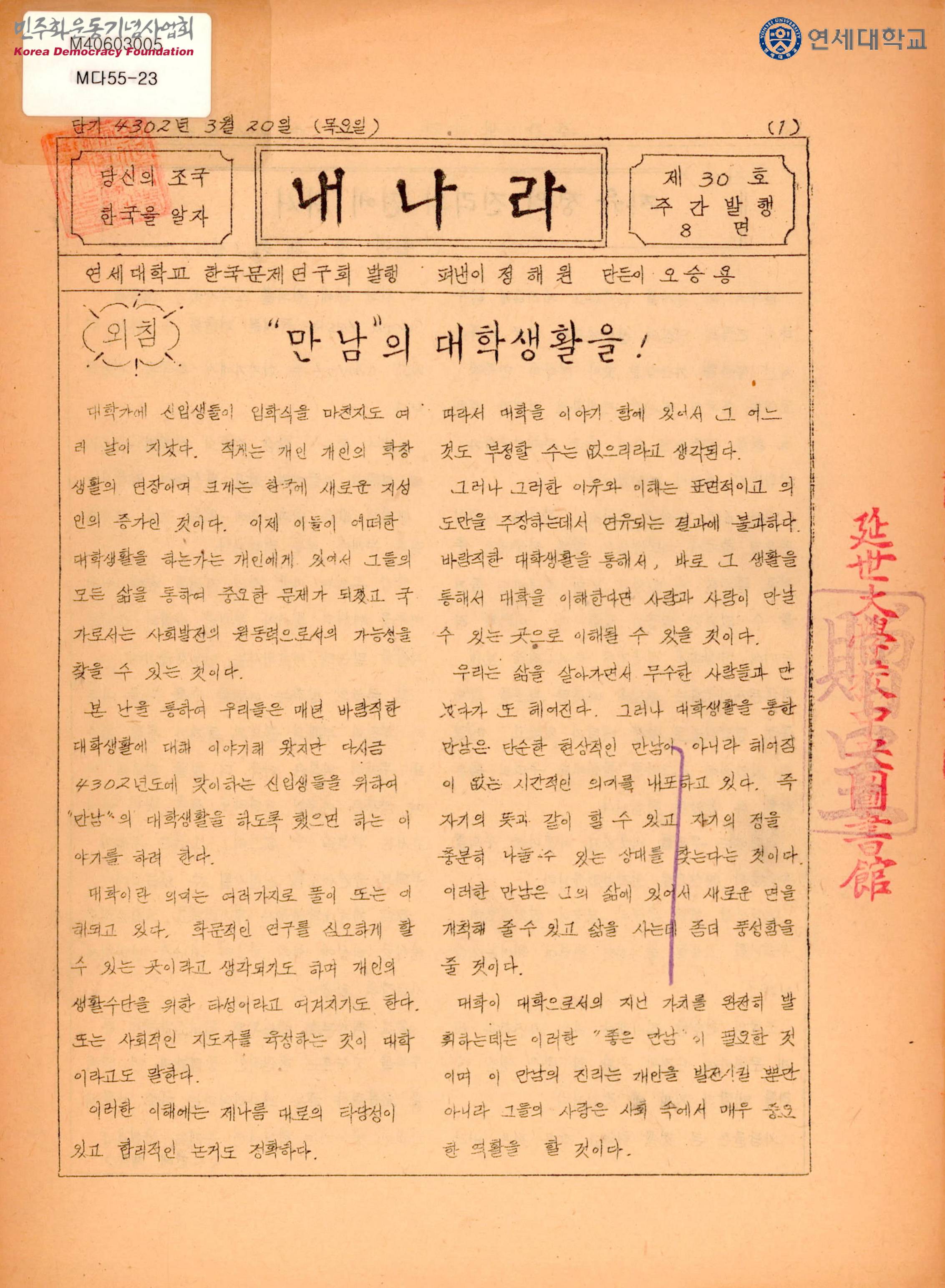 - 한국학생활동의 실태와 신입생들을 환영하는 내용이 담긴 정간물로 목차는 다음과 같음 -"만남"의 대학생활을! -자유 정의 진리의 편에 서서 -새로이 임원을 맡은 붇들께 -신입회원 명단 -대학생의 사회관 -한국학생활동 실태조사 경과보고 -한국문제연구회 단기 4302년도 제1학기 사업계획서