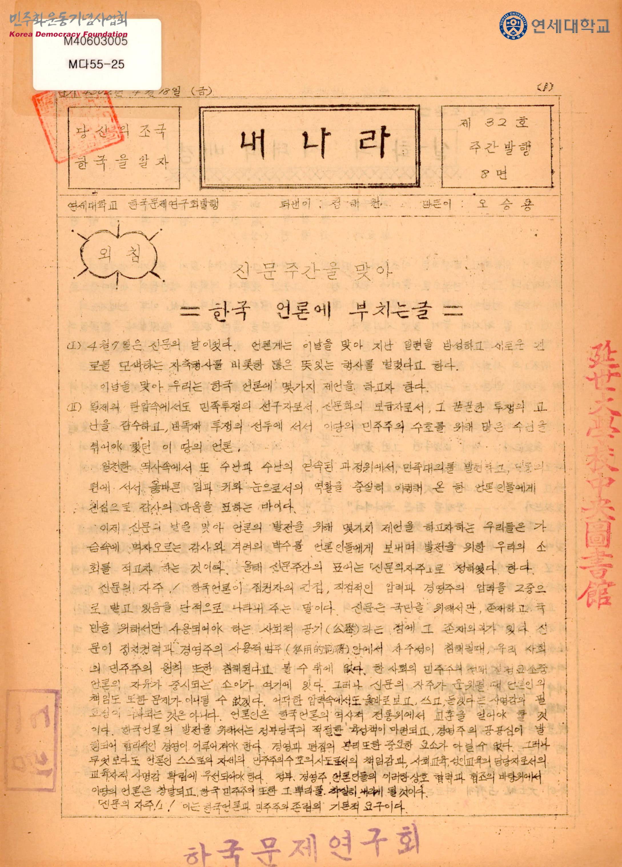 - 실학의 시대적 배경과 한국언론에게 당부하는 내용이 담긴 정간물로 목차는 다음과 같음 -신문주간을 맞아 - 한국 언론에 부치는 글 -실학의 시대적 배경 -벌레먹은 일본쌀 -나의 한연 입회 동기 -우리는 좀 더 적극적으로 서클 활동에 참여해야 한다