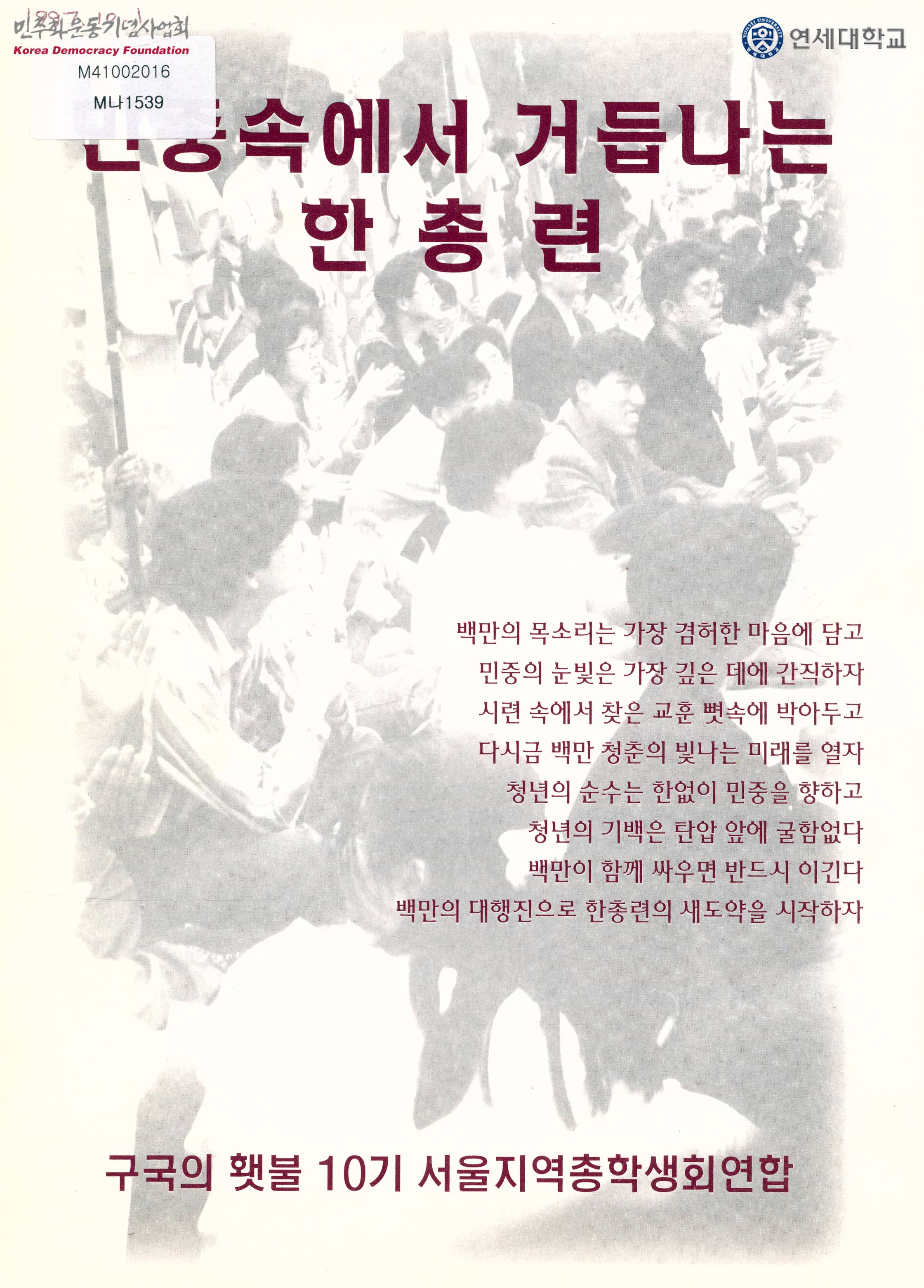 - 한국대학생총학생회연합에 대한 탄압 내용 등이 수록된 자료집으로 목차는 다음과 같음 -서총련의장 권한대행 호소문 -공안탄압사례 -논설 백만의 힘으로 한총련을 지켜내자 -논설 민중의 지지 위에서 전진하는 한총련 -공안탄압일지