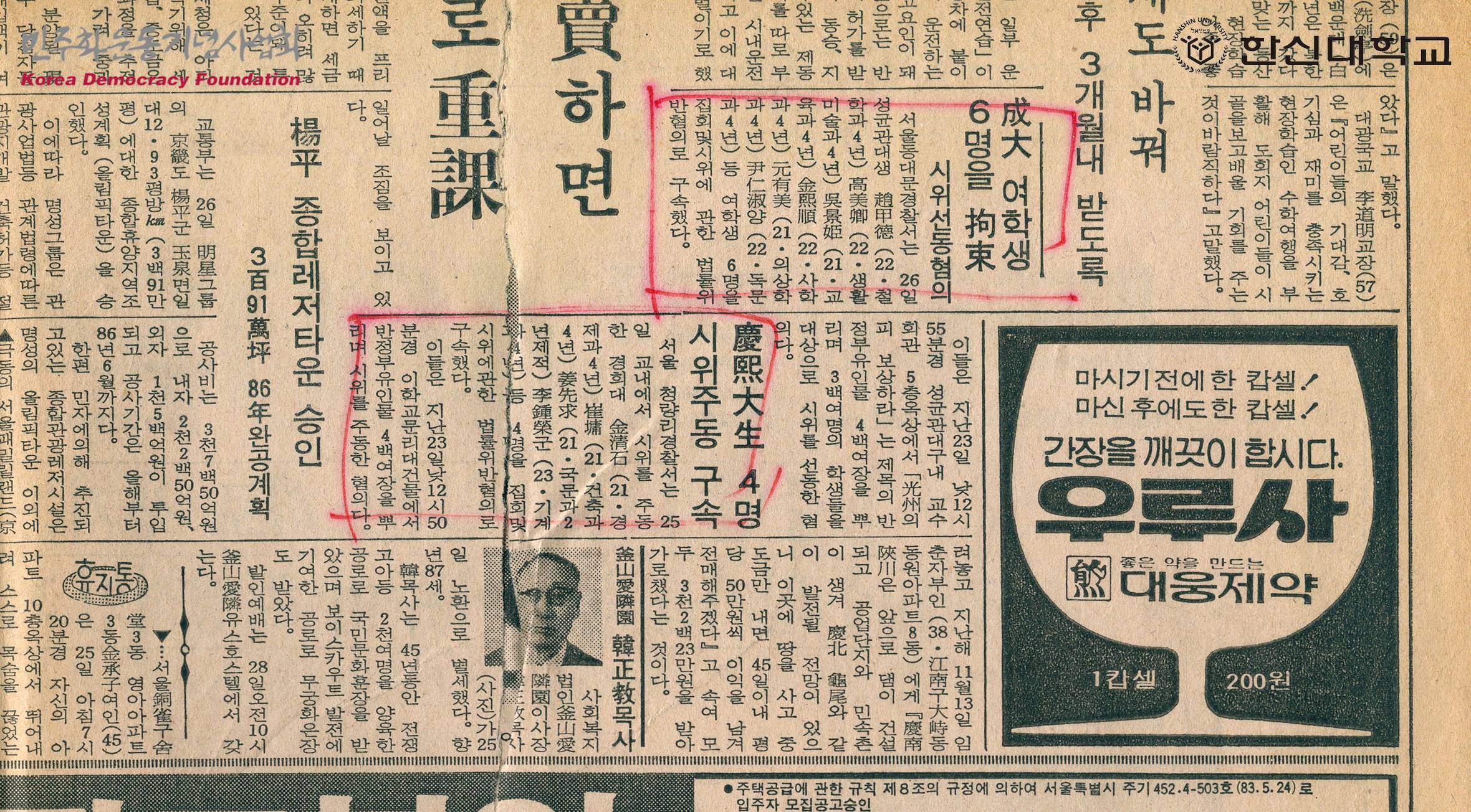 - 5월 23일 「광주의 피 보상하라」는 제목의 반정부 유인물을 뿌리며 학생들을 대상으로 시위를 선동한 혐의로 조갑덕 등 성균관대생 5명을 구속했다는 내용의 기사와 같은 날 경희대 문리대 건물에서 반정부 유인물 400여 장을 뿌리며 시위를 주동한 혐의로 김청석 등 4명을 구속했다는 내용의 기사 등이 실린 신문스크랩