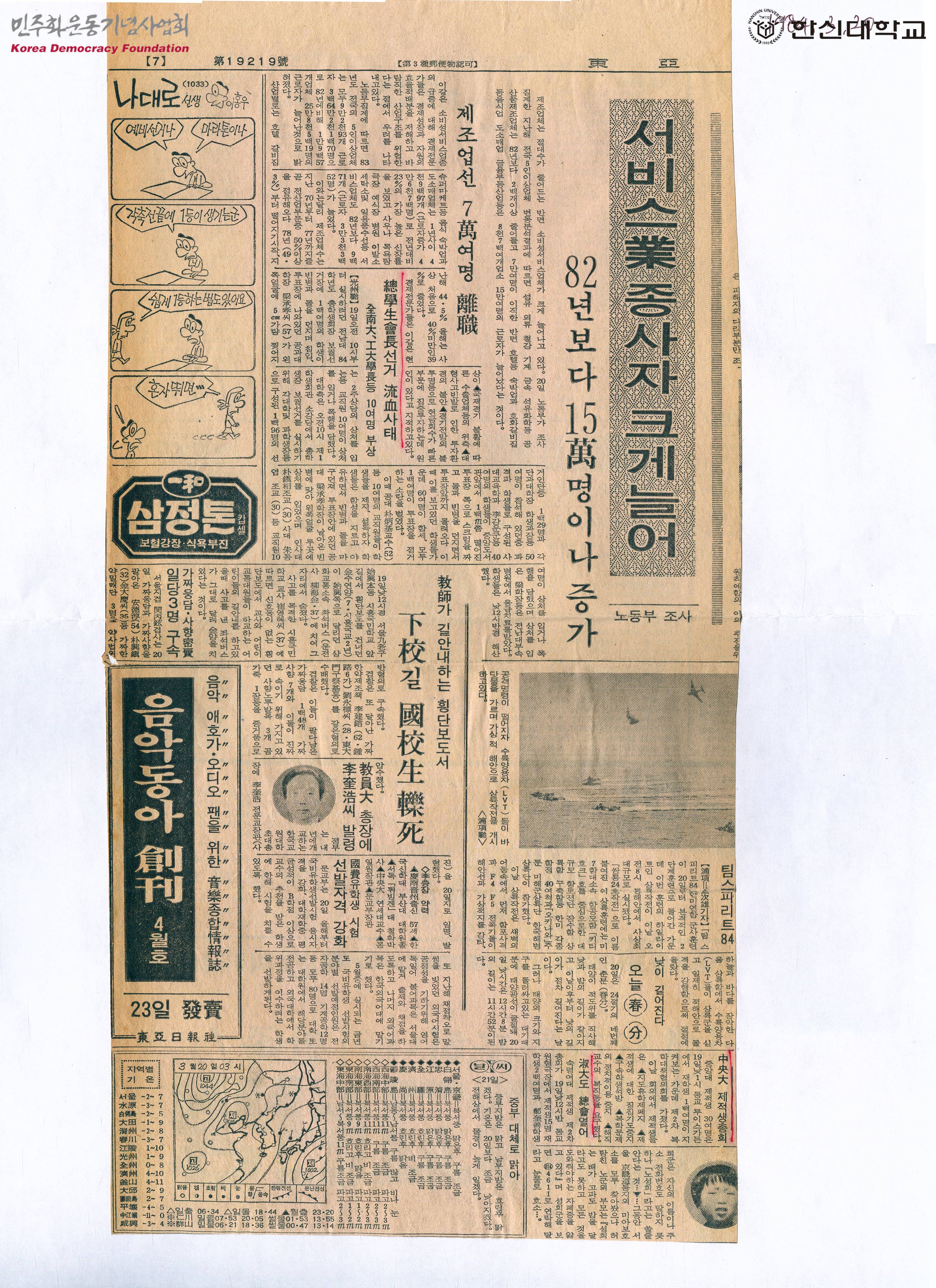 - 전남대 84학년도 총학생회장 보궐선거장에 백여 명의 학생들이 빈병과 돌을 던지며 투표장에 침입해 공과대학장 양승효 등 교직원 10여 명이 상처를 입거나 폭행을 당했다는 기사와 중앙대에서 제2차 복학대책협의회가 열렸다는 기사, 숙명여대에서 제2차 제적생 총회가 열렸다는 기사 등의 신문스크랩