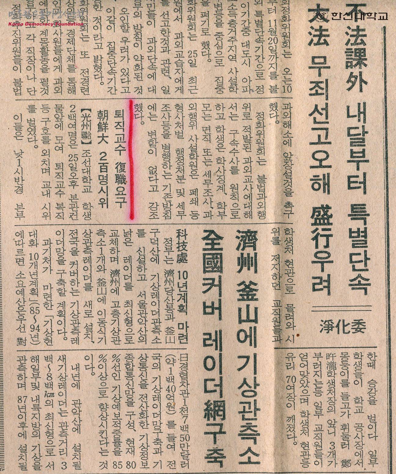 - 조선대 학생 2백여 명이 퇴직교수의 복직을 요구하며 교내 시위를 벌였다는 기사 등이 실린 신문스크랩