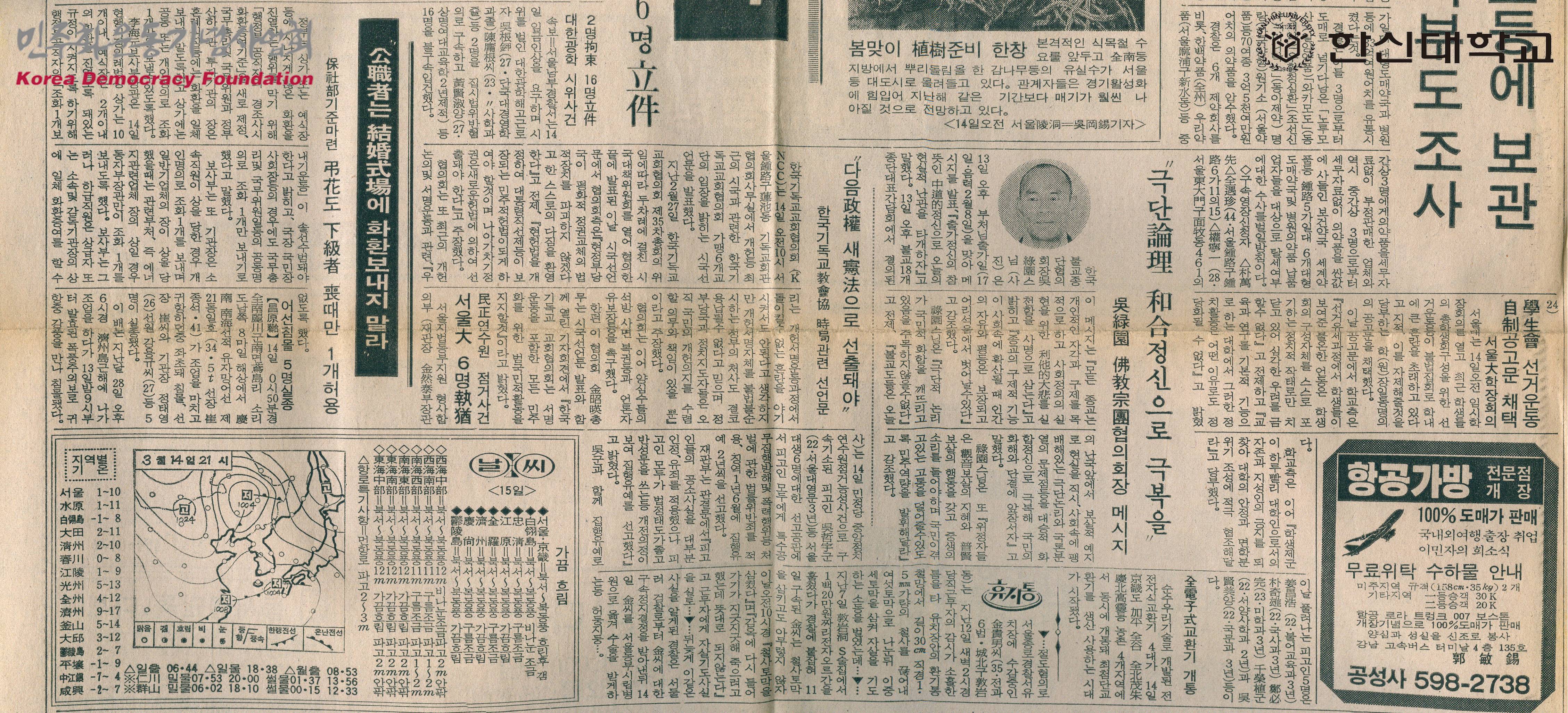 - 서울대가 임시학장회의를 열고 총학생회 선거운동이 불법집회로 학내에 큰 혼란을 초래하고 있다고 지적하고 이를 자제해 줄 것을 당부하는 학장일동평의의 공고문을 채택했다는 기사, 한국기독교교회협의회에서 '다음 정권은 새 헌법으로 선출돼야' 한다는 시국관련 선언문을 발표했다는 기사 등이 수록된 신문스크랩