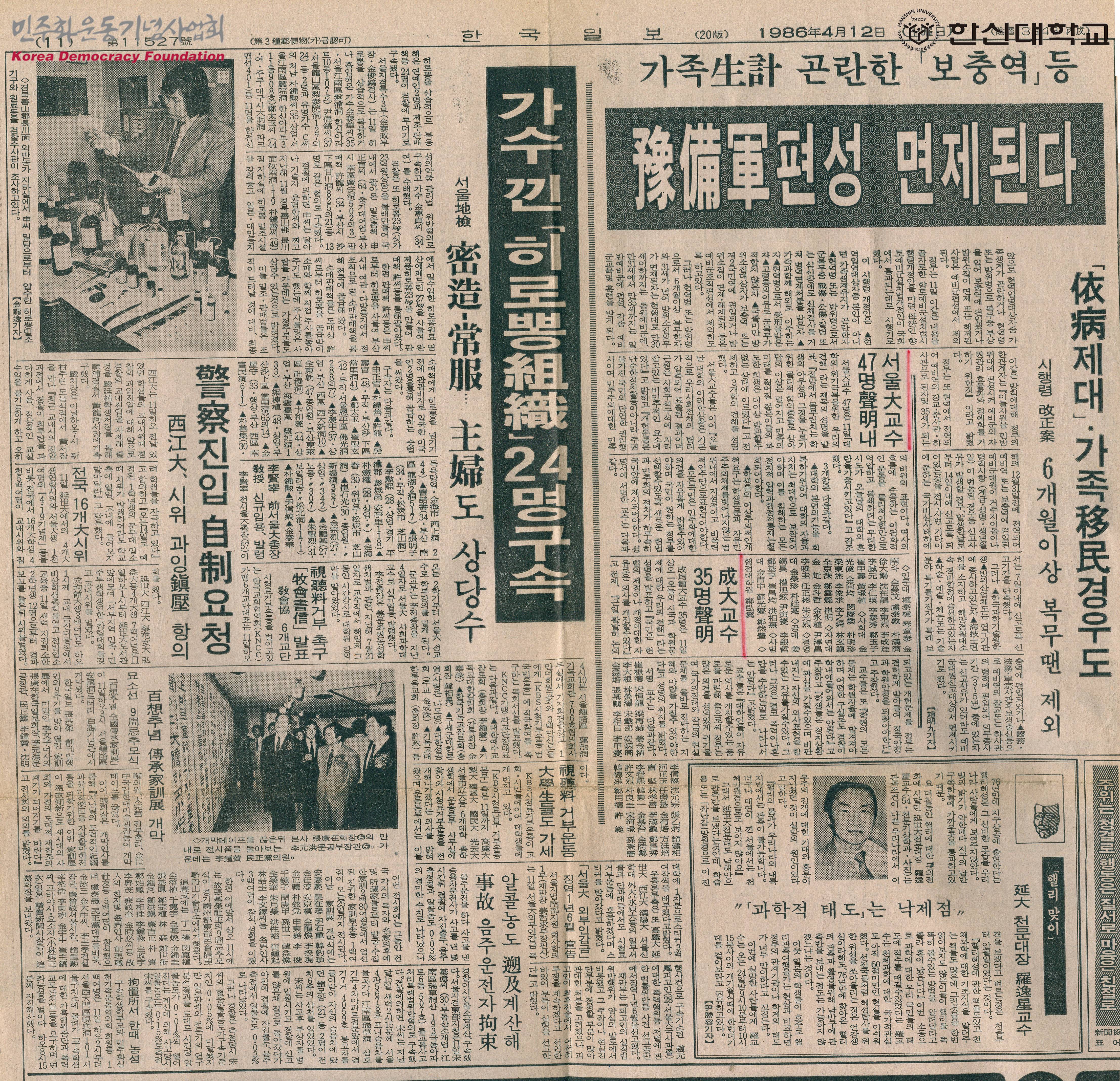 - 성균관대학교 교수 35명이 '오늘의 시국과 학원문제에 대한 우리의 견해'라는 성명을 발표했다는 기사, 서울대학교 교수 47명이 '대학의 위기극복을 위한 우리의 견해'라는 시국선언문을 발표했다는 기사, 서강대학교에서 학생들의 교내시위 때 경찰의 과잉진압에 대해 앞으로 교내 진입을 자제해 줄 것을 촉구했다는 기사 등이 수록된 신문스크랩