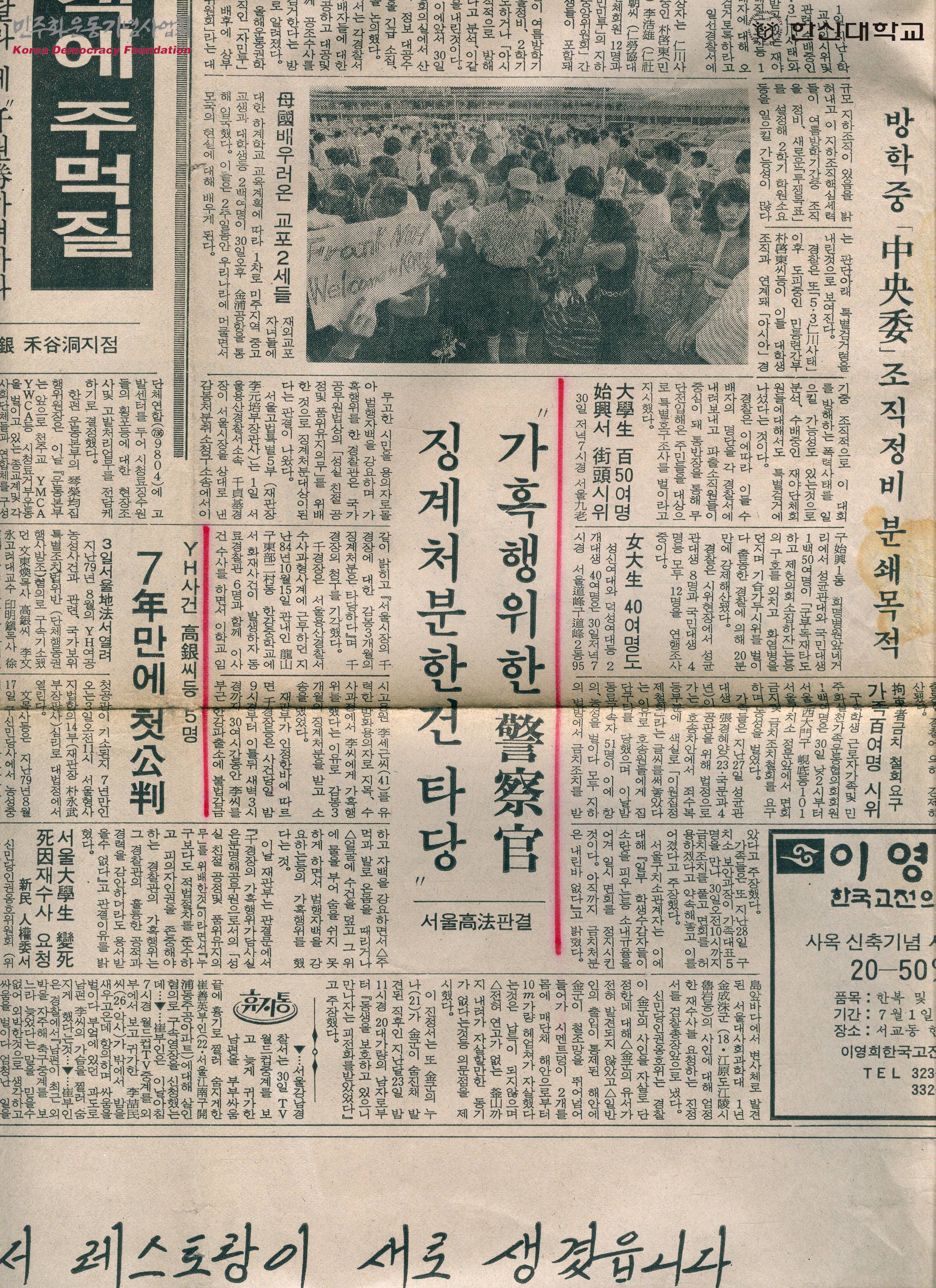 - 서울고등법원 특별5부가 용산경찰서 천정기 경장이 서울시장을 상대로 낸 감봉처분취소청구소송에서 감봉 3개월의 징계처분은 타당하다며 청구를 기각했다는 내용의 기사, YH여공농성사건과 관련하여 구속됐던 문동환, 고은 등 5명에 대한 첫 공판이 기소된지 7년 만인 7월 3일 오전에 진행된다는 내용의 기사 등이 수록된 신문스크랩
