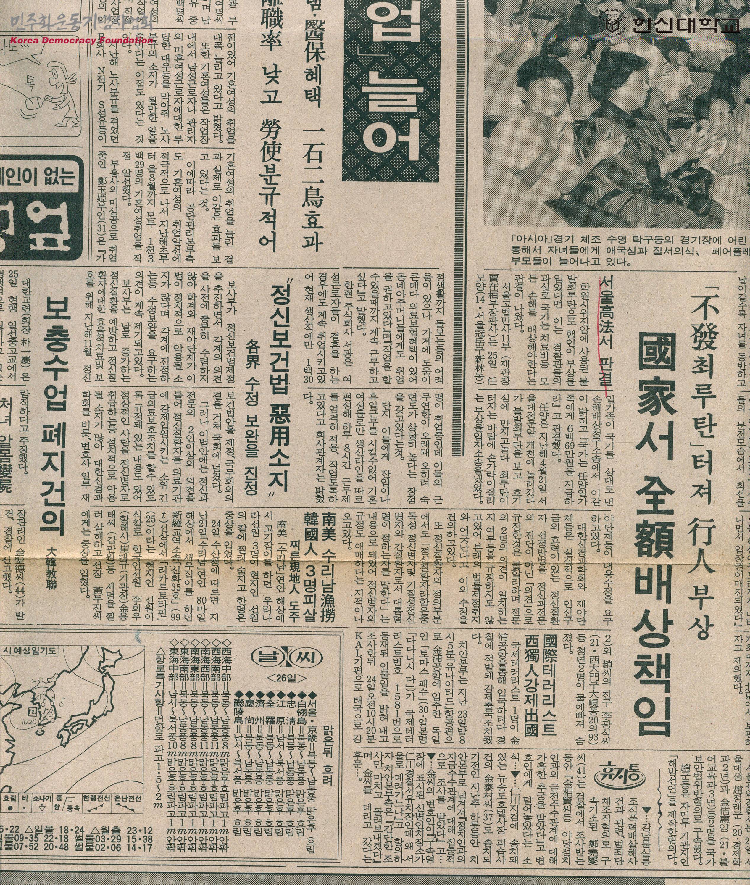 - 학원시위 진압에 사용된 불발 최루탄으로 행인이 부상을 입었다면 이에 대해 국가가 손해를 배상해야 한다는 판결이 나왔다는 내용의 기사가 수록된 신문스크랩