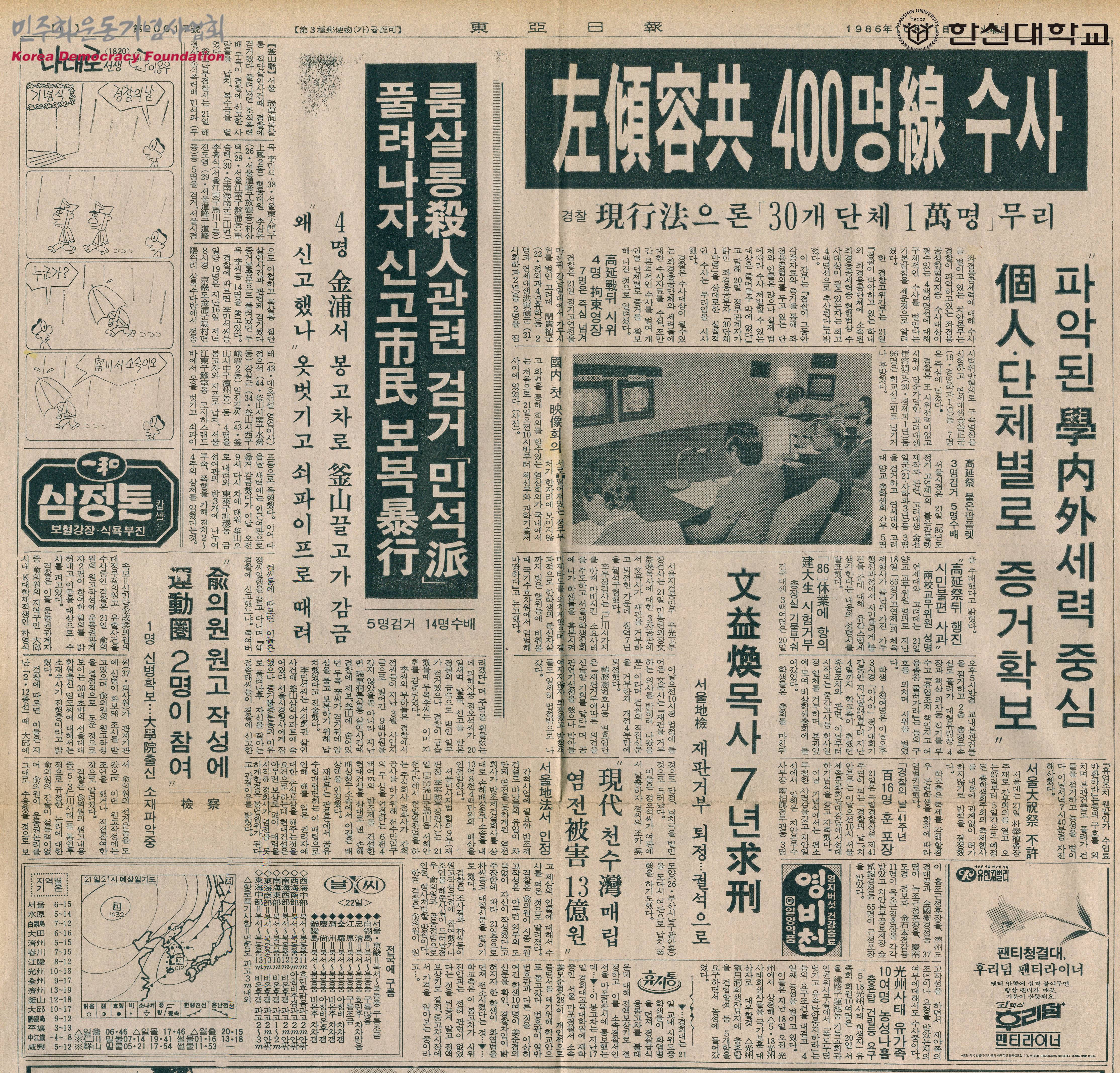- 좌경용공세력을 수사하고 있는 치안본부가 좌경용공성향의 혐의자 중 수사대상이 될 수 있는 사람은 최대 400여 명으로 추산되고 이들에 대한 구체적인 수사방안을 세운다는 방침을 세웠다는 내용의 기사, 연세대학교와 고려대학교가 교무위원 명의로 '86정기 고연제' 후 발생한 시위에 대한 유감을 표하는 내용의 성명서를 발표했다는 내용의 기사, 건국대생 300여 명이 '아시아 경기대회' 기간의 휴업조치에 대해 항의하며 시험을 거부하고 있다는 내용의 기사, 민통련의장 문익환에게 징역 7년을 구형했다는 내용의 기사 등이 수록된 신문스크랩