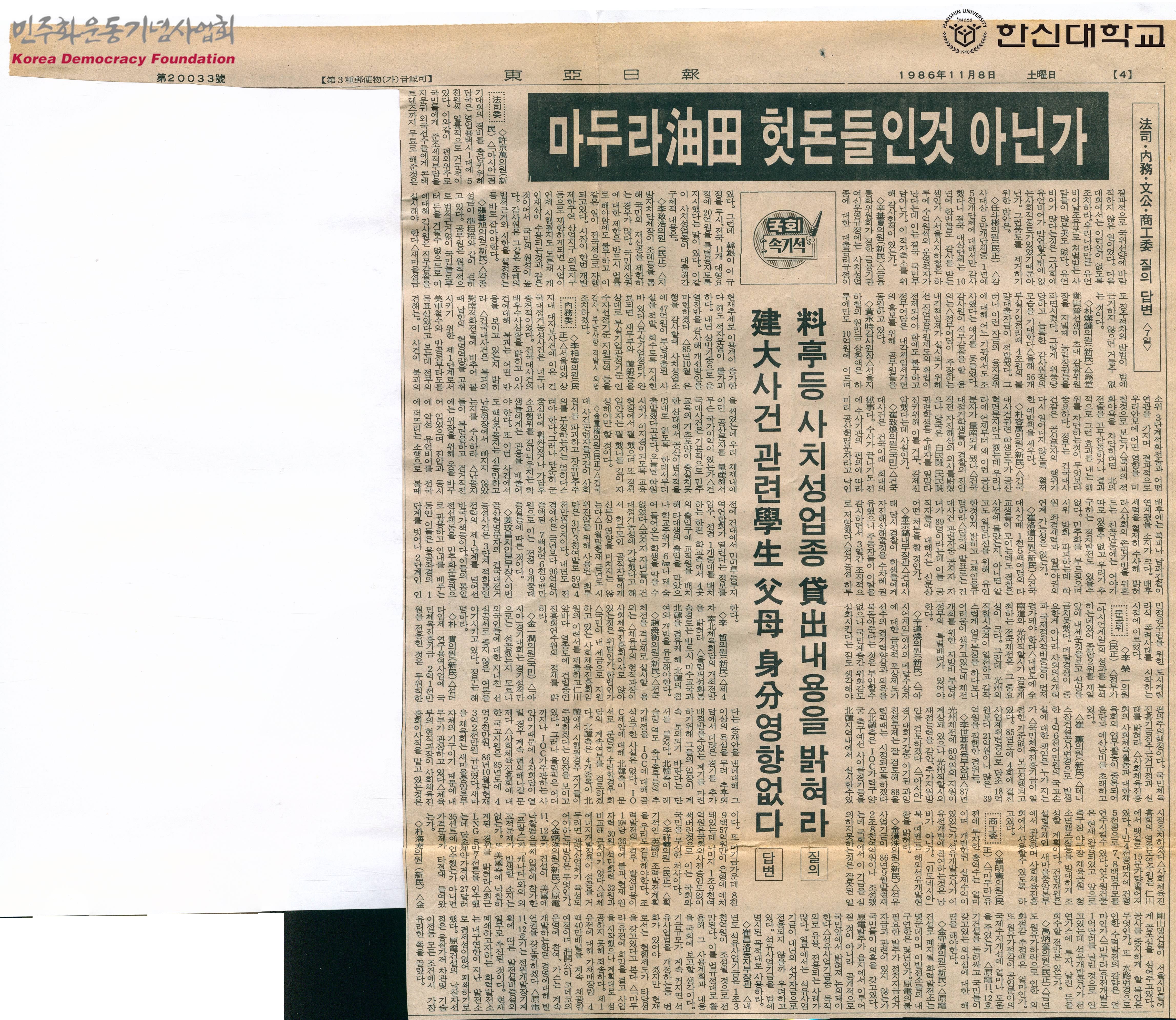 - 건국대 점거농성사건과 관련하여 건국대 농성 당시 학생들의 자진 해산 의사를 당국에서 거부했다는 의혹, 운동권 학생 일망타진을 위한 경찰의 사건 유도 의혹, 학원 좌경세력과 일부야권의 연계 의혹 등을 비롯한 11월 7일 국회 상임위에서 제기된 여러 질의와 답변이 담긴 기사의 신문스크랩