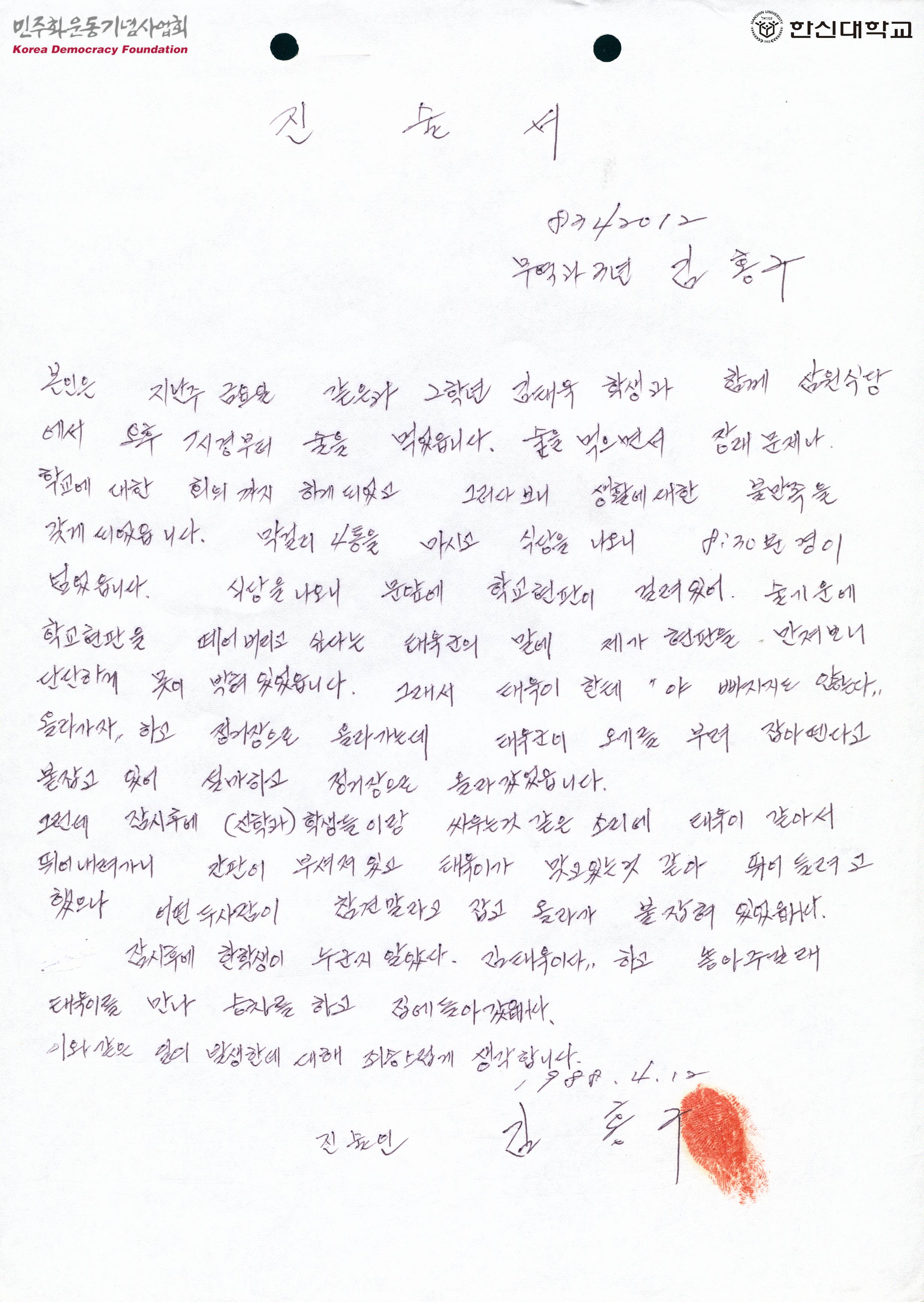 - 순찰중인 김상락이 달려와 신원 미상의 학생들이 정문에서 현판을 부순다고 하여 근무자들이 이를 저지했으며 학생들에게 학생증을 요구하자 칼로 위협당한 내용이 적힌 경위서와 사건 당사자인 김홍구, 김태욱의 진술서