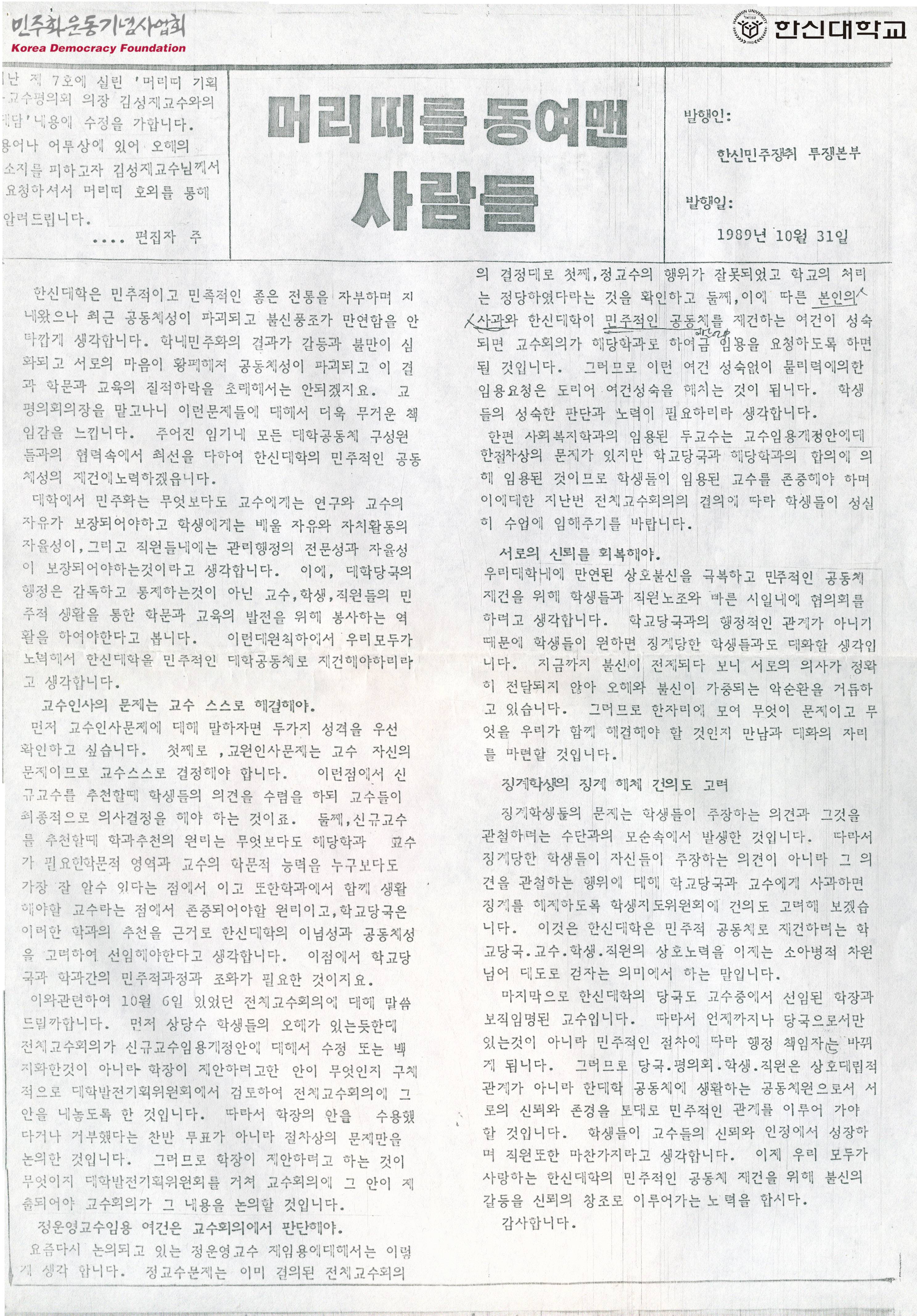 머리띠를 동여맨 사람들 호외[김성재 교수평의회 의장 입장문]